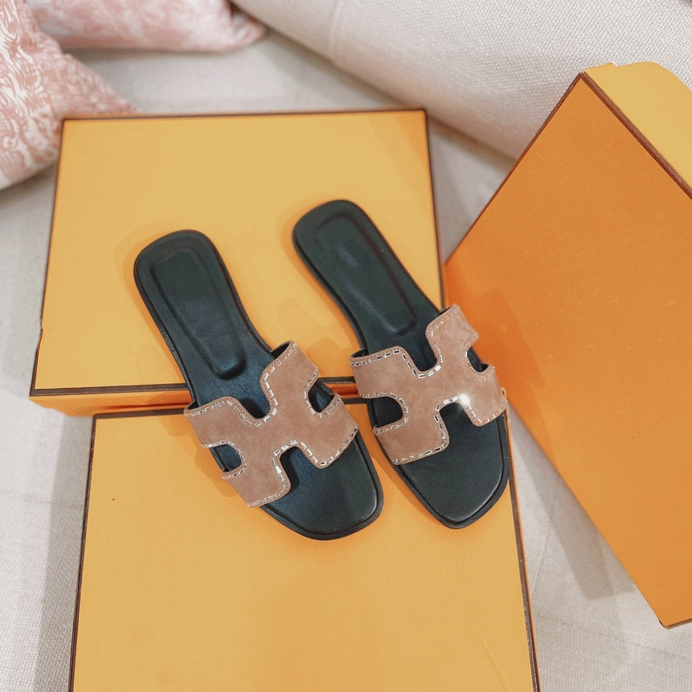 0ran Sandal Calfskin Rhinestone Brown