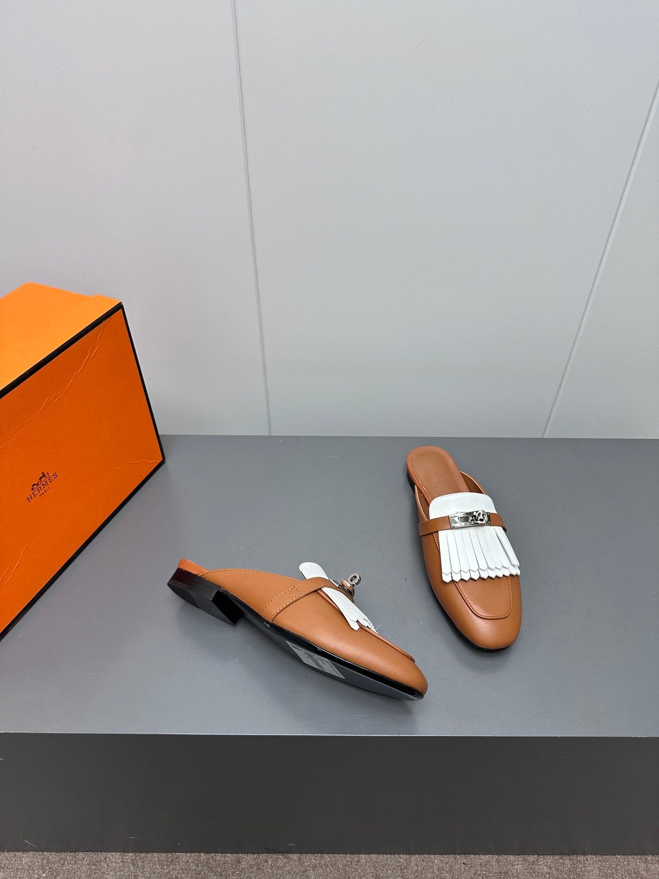 0Z MULE IN BRONZE BROWN LAMBSKIN WITH WHITE FRINGE DETAIL