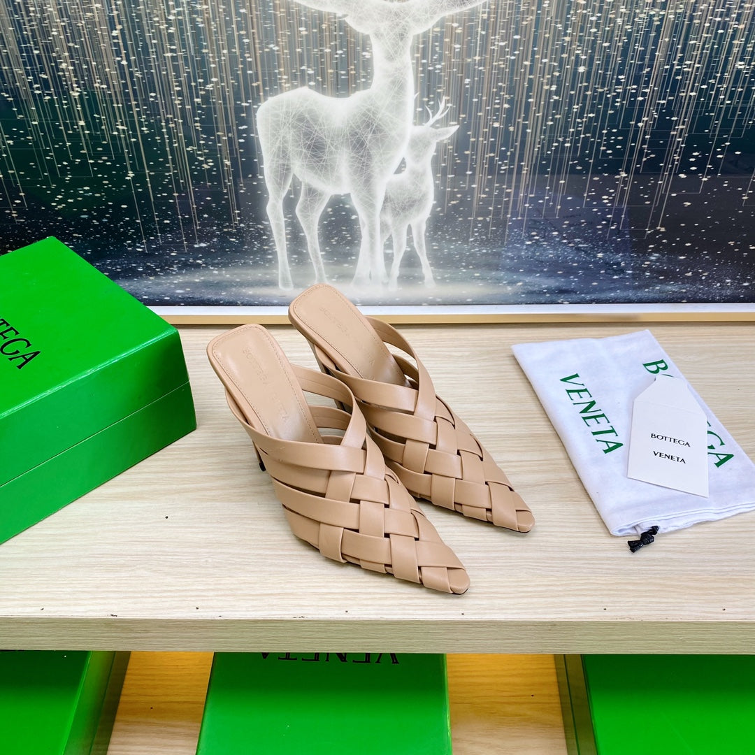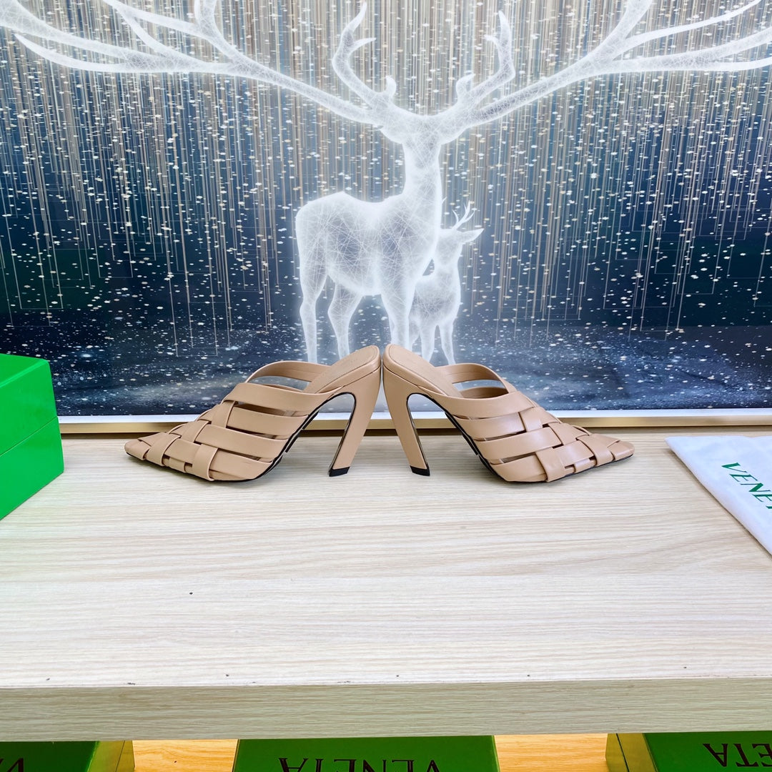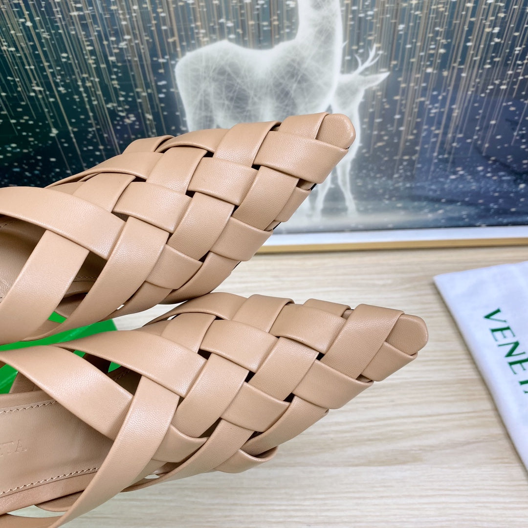 ALFIE LEATHER HIGH MULES IN CAMEL BEIGE CALFSKIN WITH WOVEN DESIGN