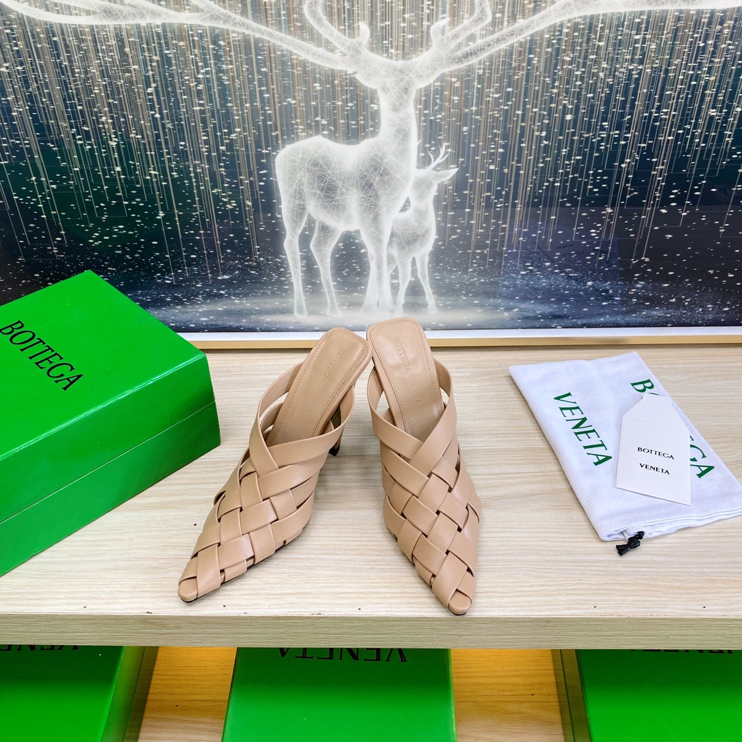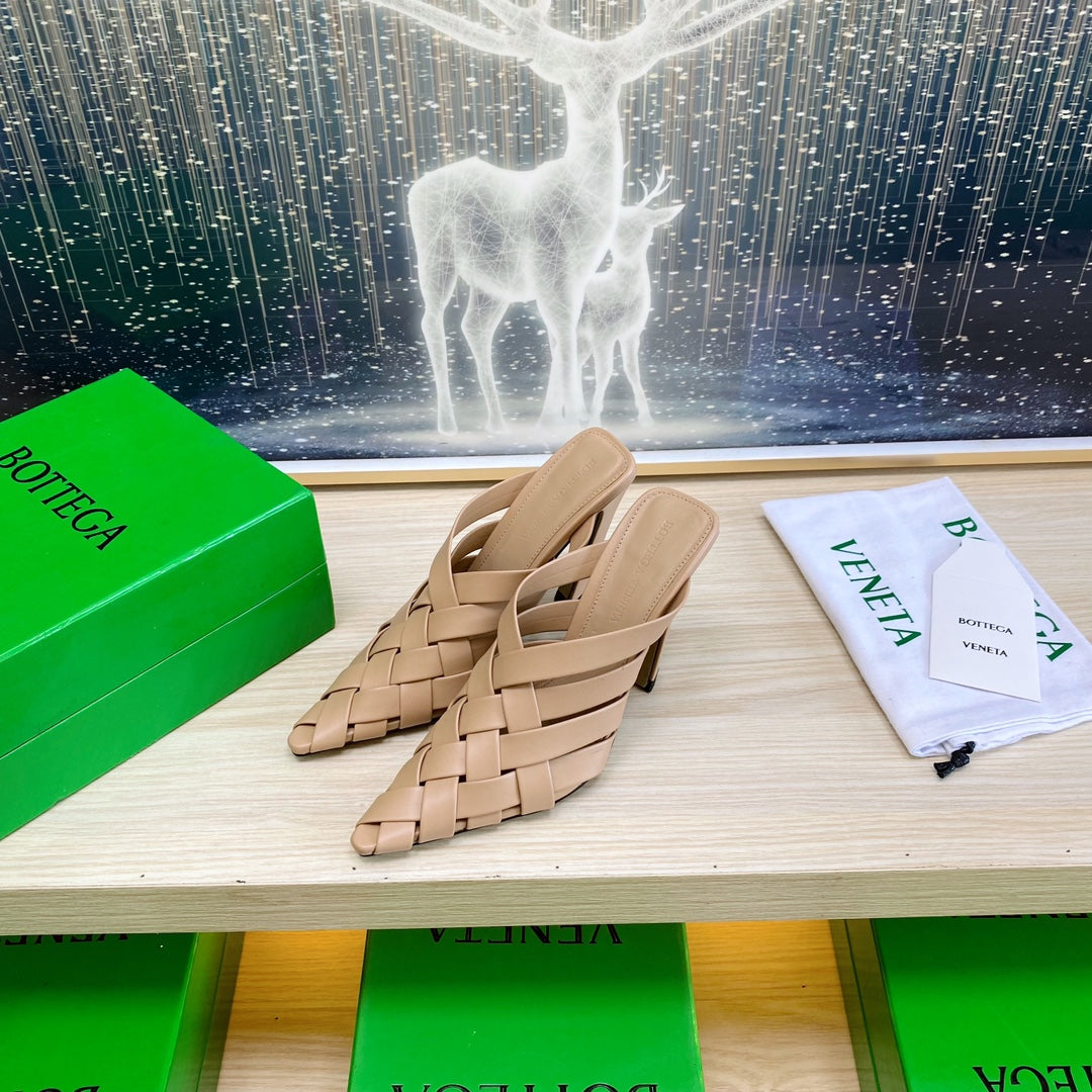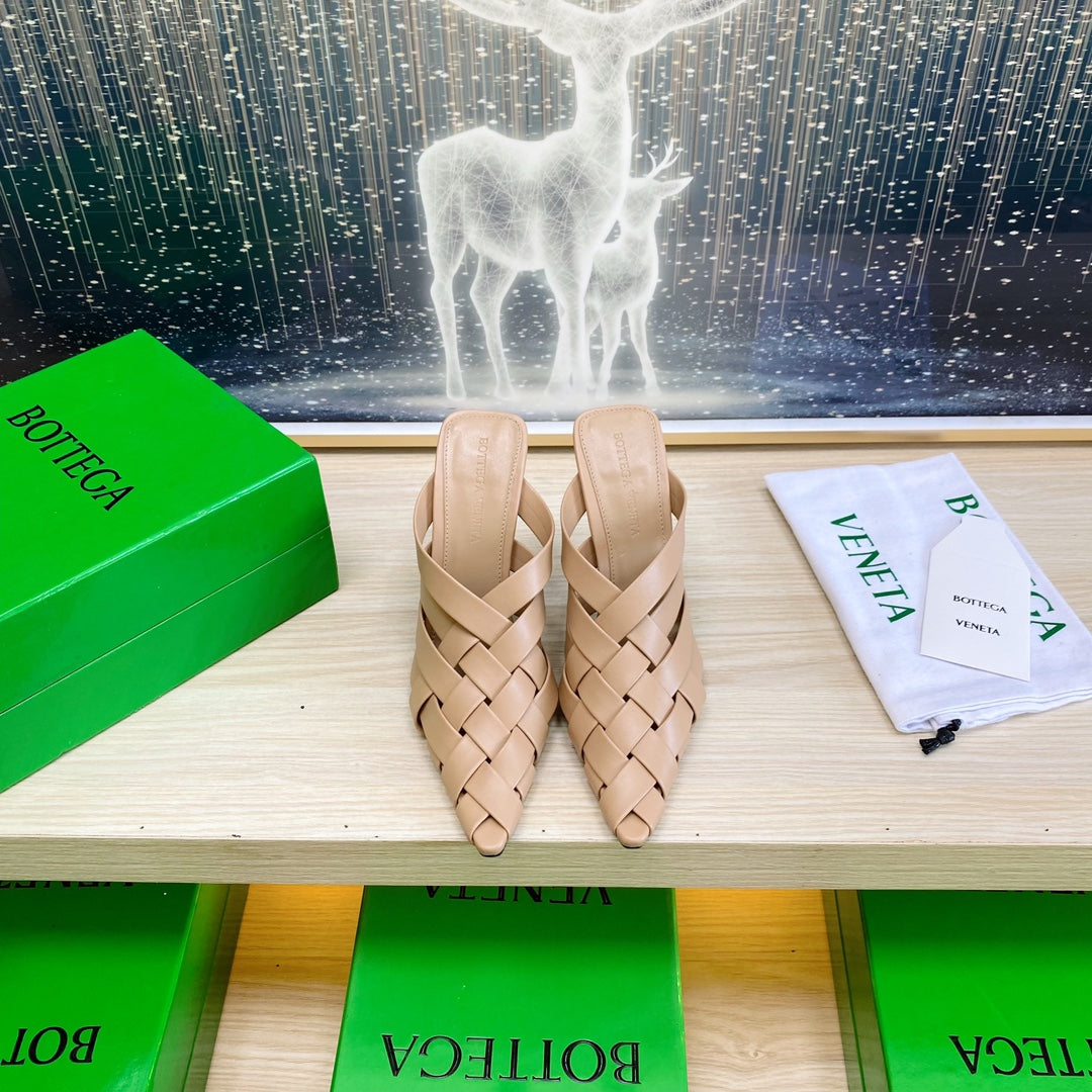 ALFIE LEATHER HIGH MULES IN CAMEL BEIGE CALFSKIN WITH WOVEN DESIGN