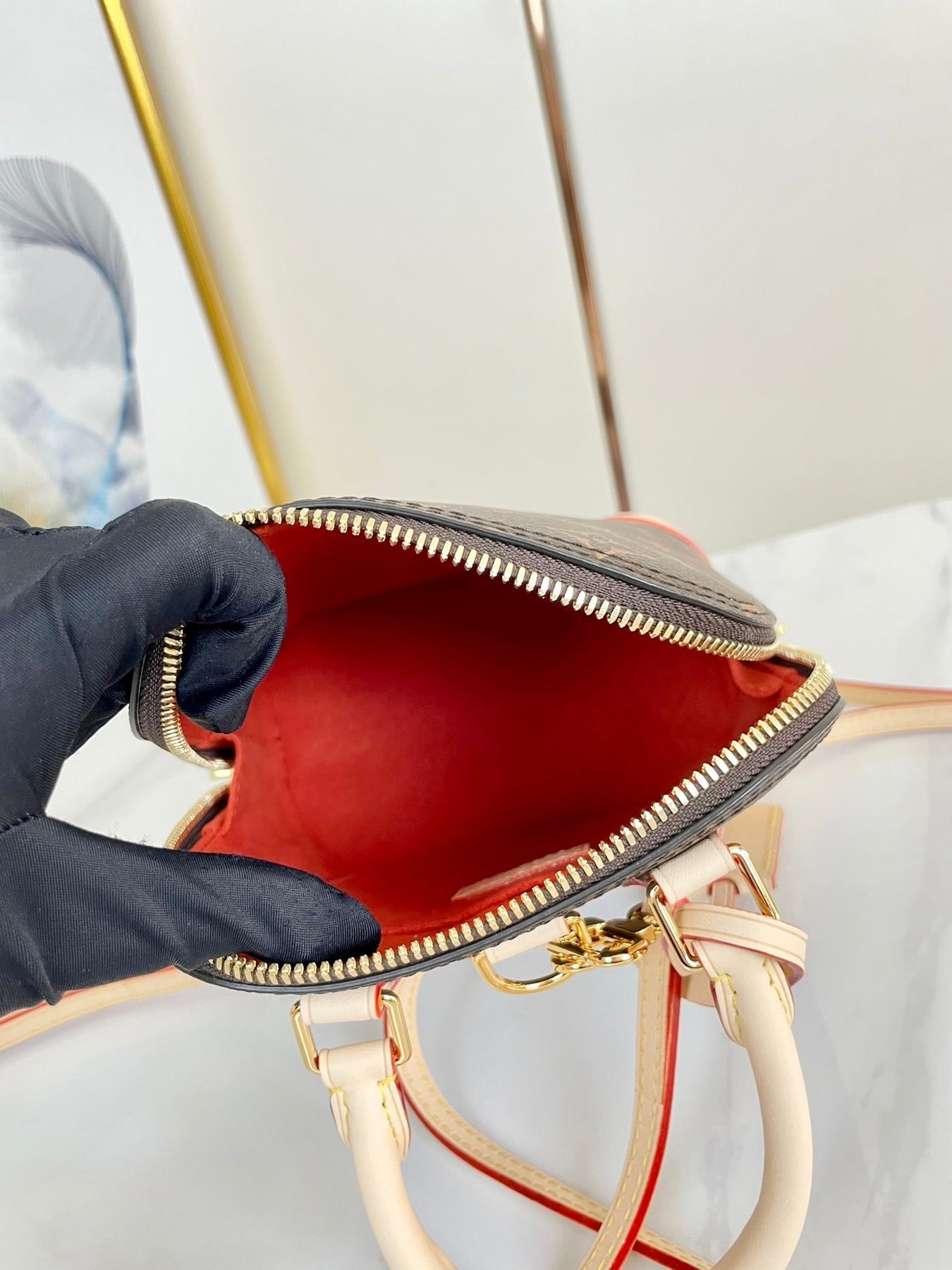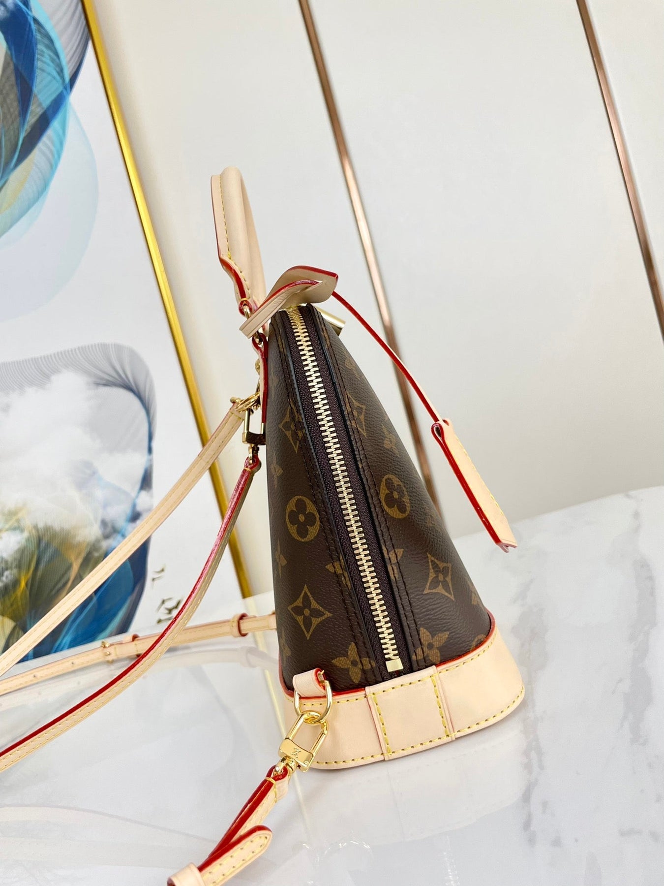 ALMA BACKPACK 20 IN BROWN MONOGRAM CANVAS AND BEIGE CALFSKIN TRIM GOLD BUCKLE