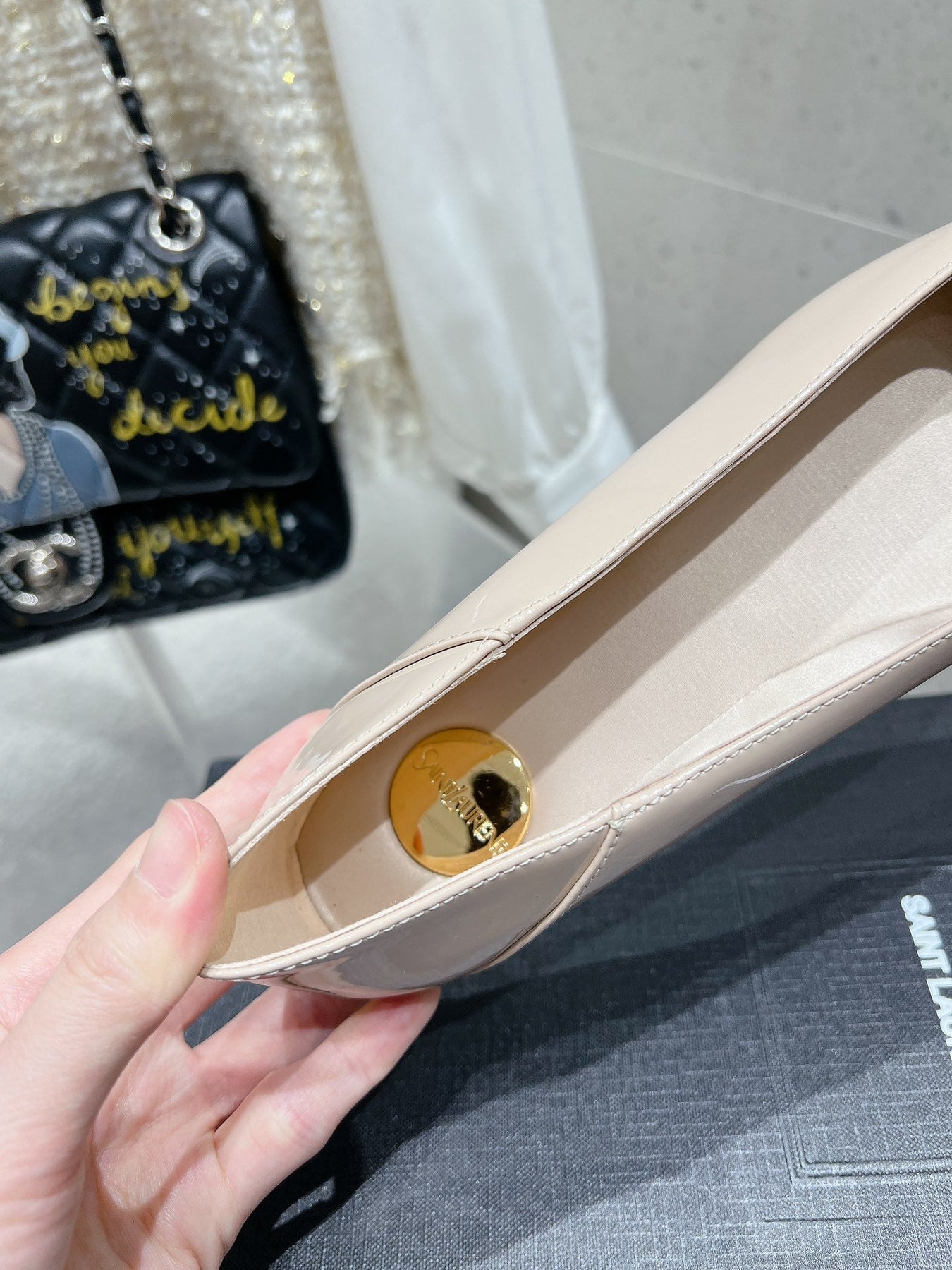 BALLERINA FLATS IN BEIGE CREAM PATENT CALFSKIN