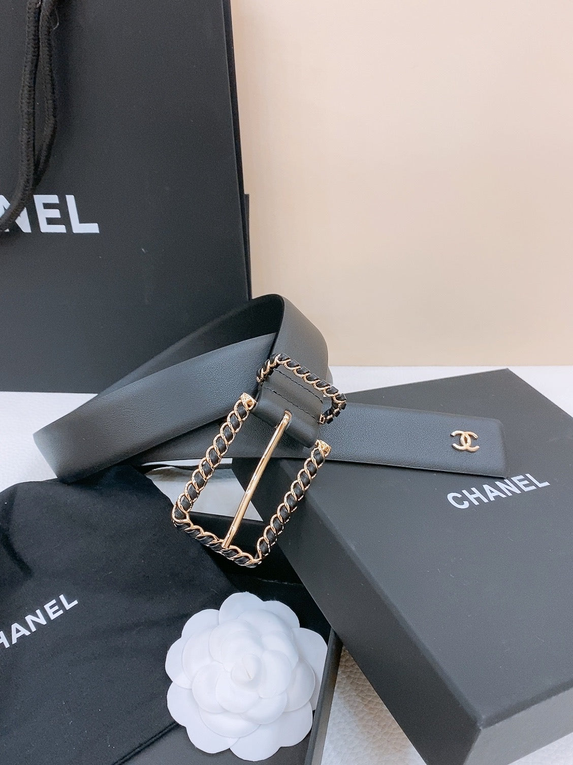 BELT 30MM IN BLACK CALFSKIN WITH INTERWOVEN GOLD CHAIN BUCKLE