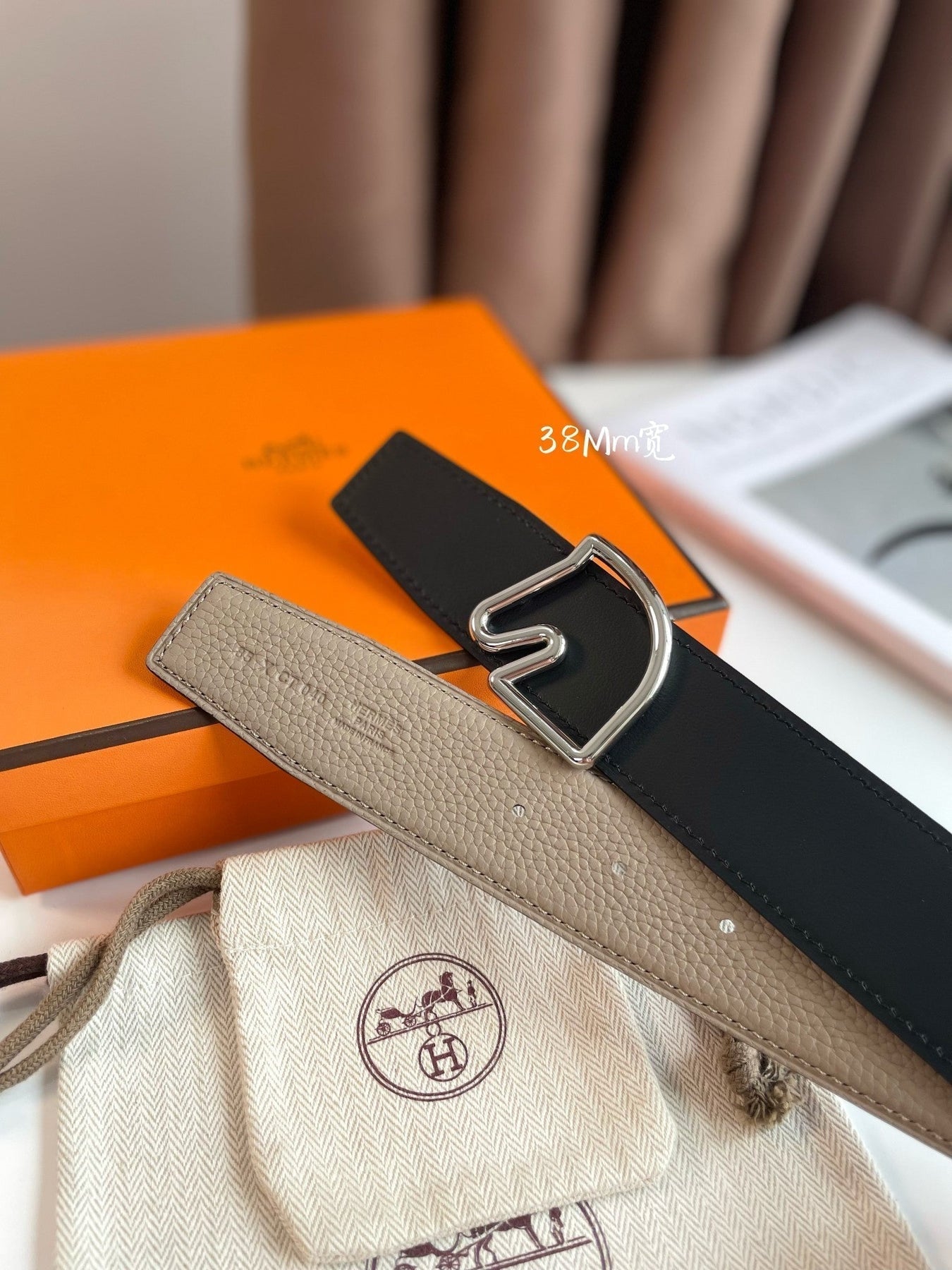 BOUCLE BELT BUCKLE & REVERSIBLE KHAKI BROWN LEATHER STRAP 38MM SILVER HARDWARE