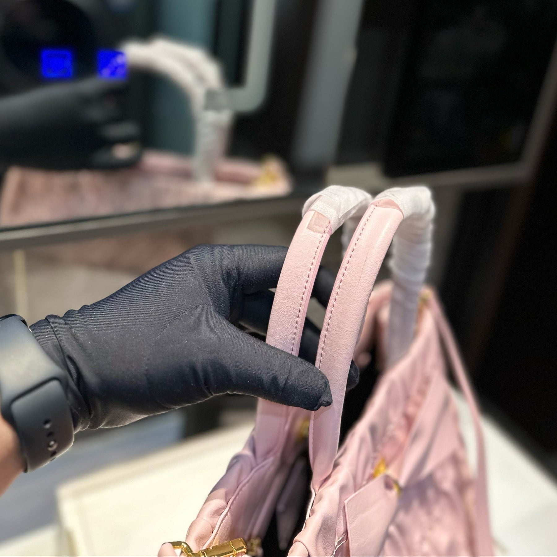 BOW DETAIL RUCHED TOP HANDLE BAG 29 IN LIGHT PINK SAFFIANO LEATHER