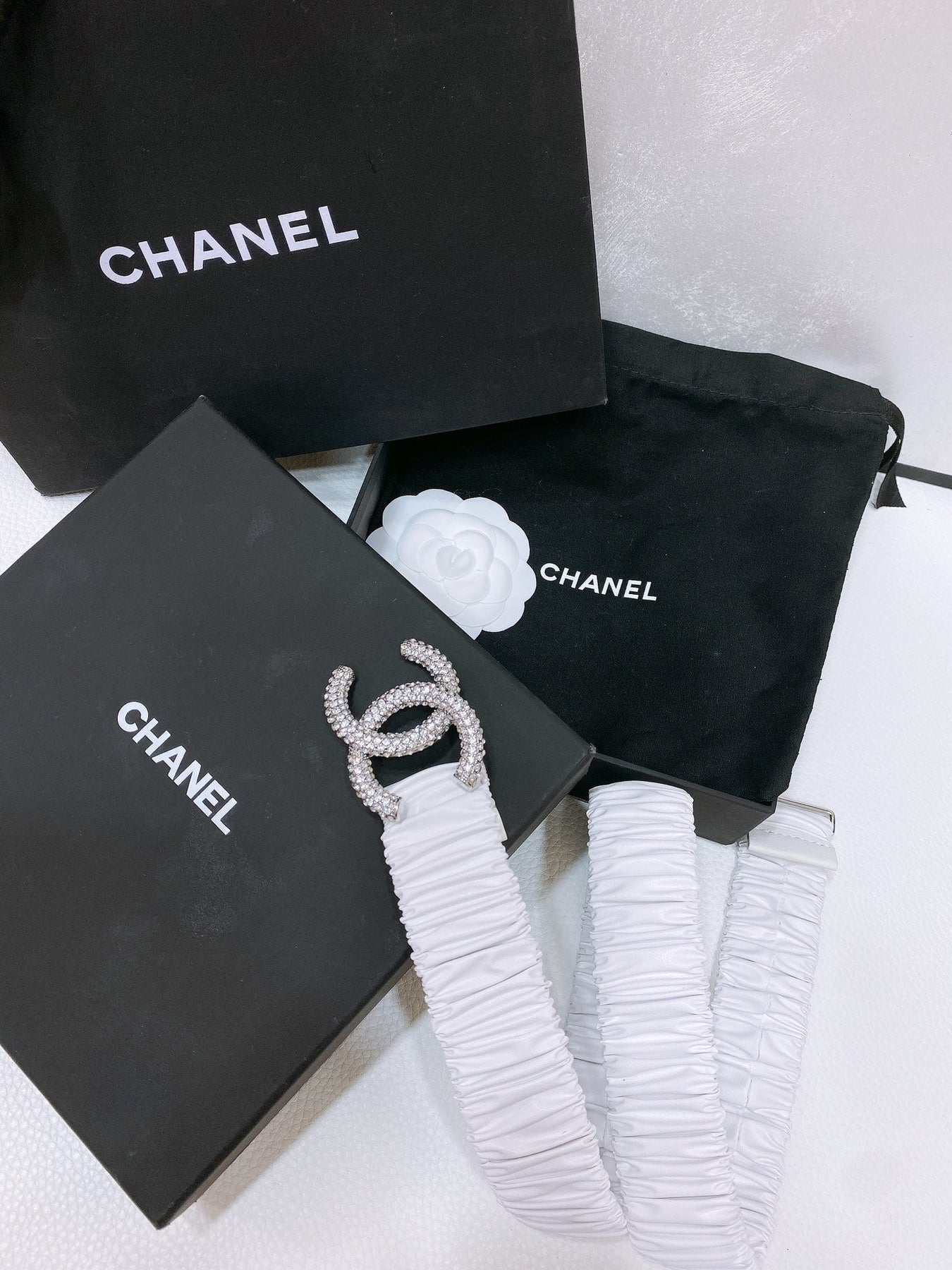 CC ELASTIC BELT 30MM IN WHITE CALFSKIN SILVER HARDWARE WITH RHINSTONES