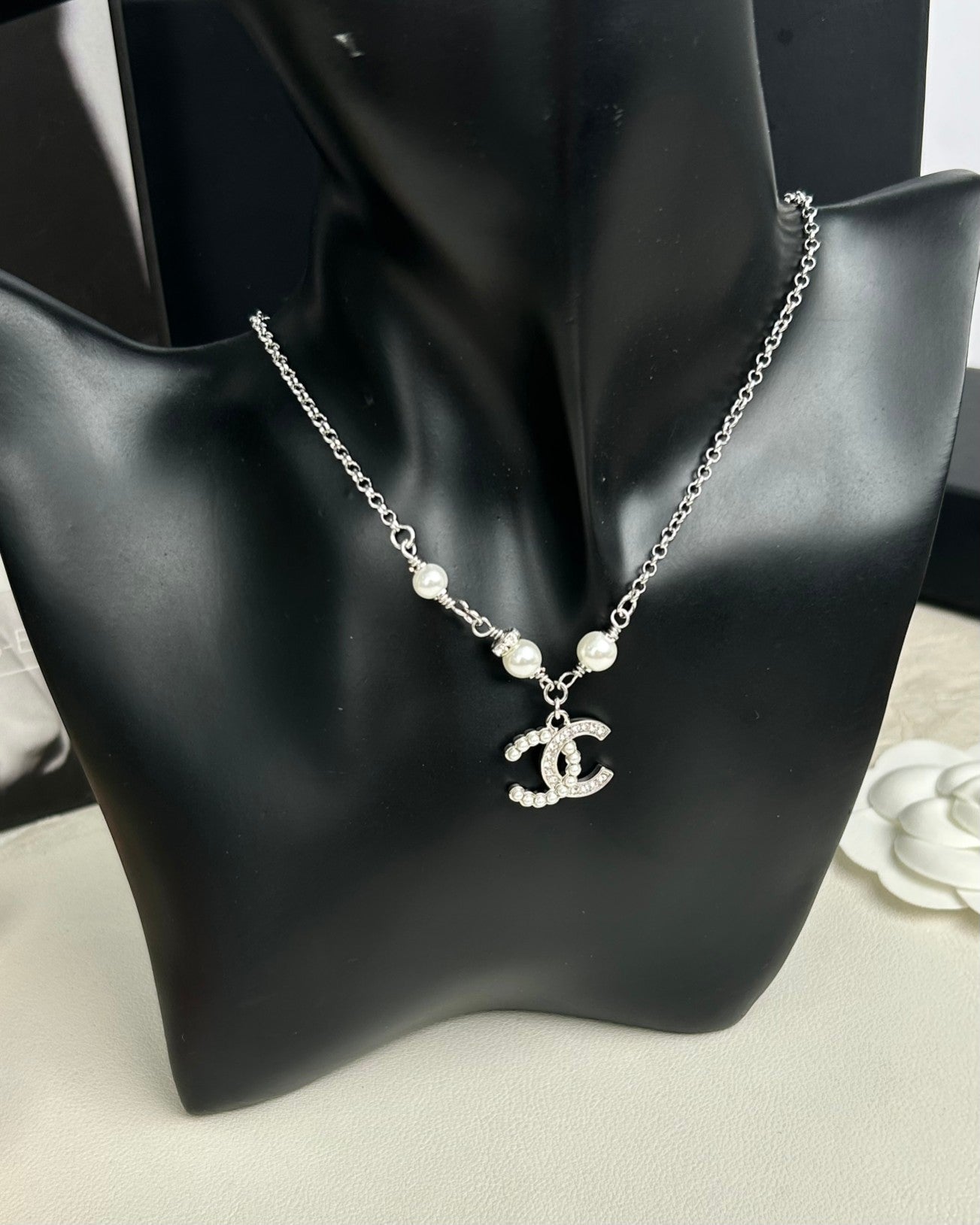 CC NECKLACE IN SILVER CHAIN WITH WHITE PEARL AND CRYSTAL EMBELLISHED LOGO