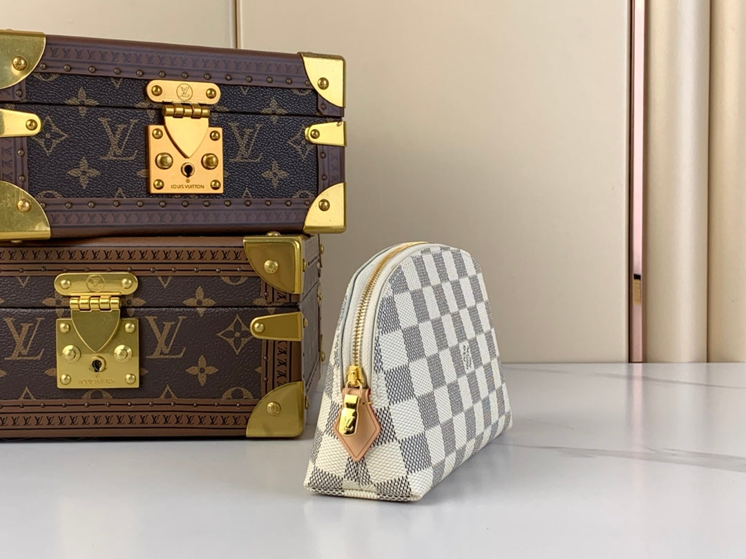 COSMETIC POUCH PM 19 IN WHITE GRAY DAMIER AZUR CANVAS
