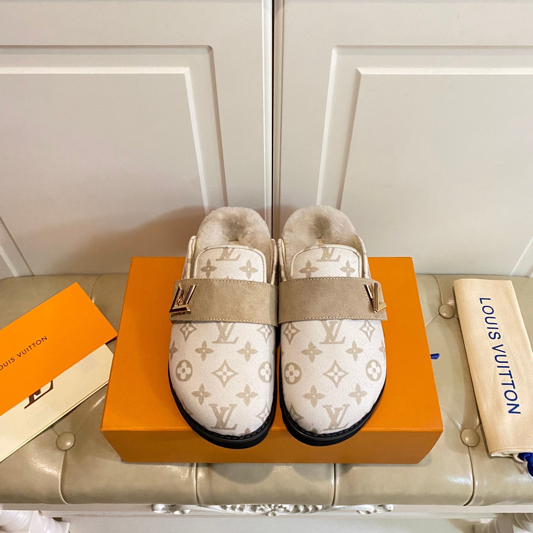COSY FLAT COMFORT CLOG IN BEIGE MONOGRAM FABRIC AND SUEDE