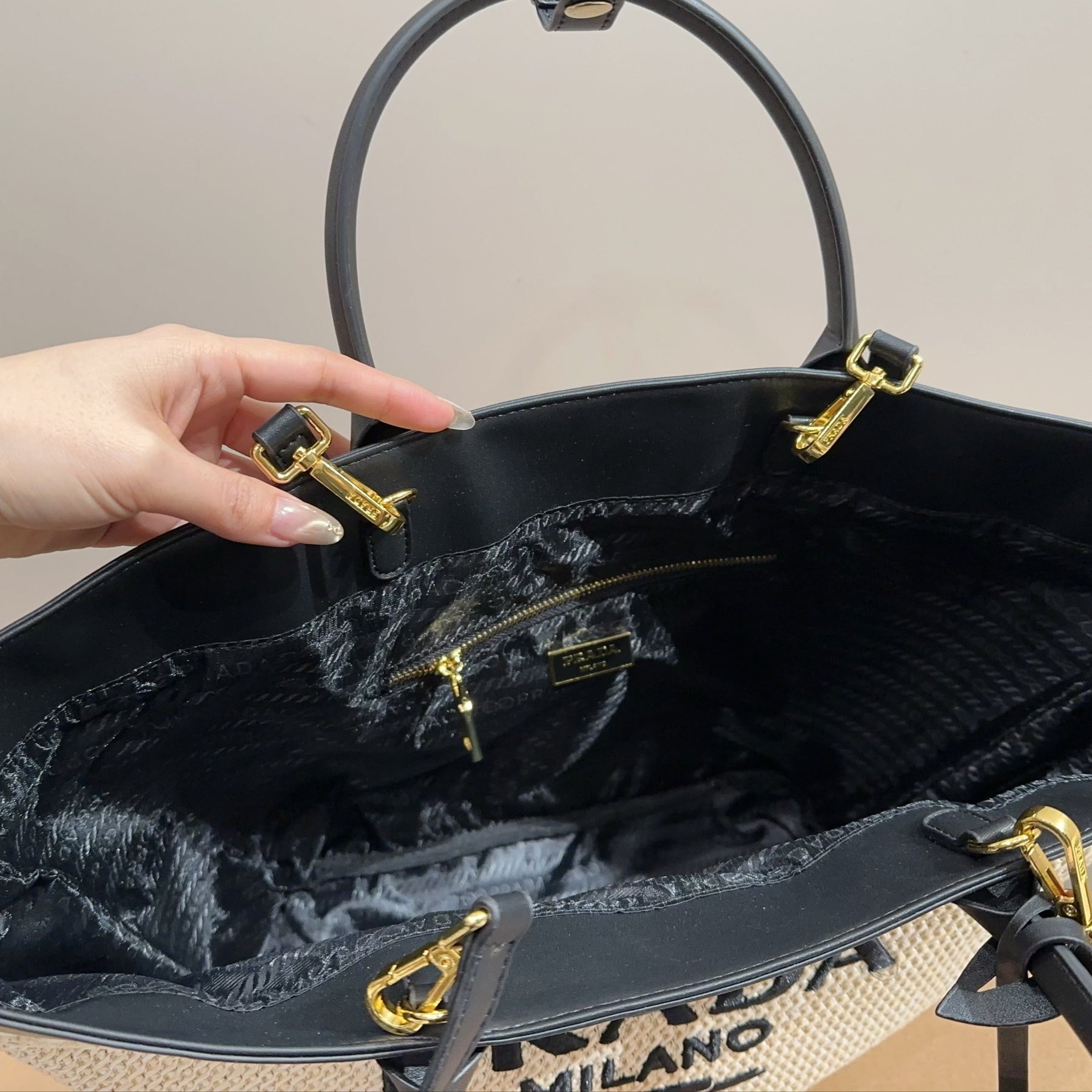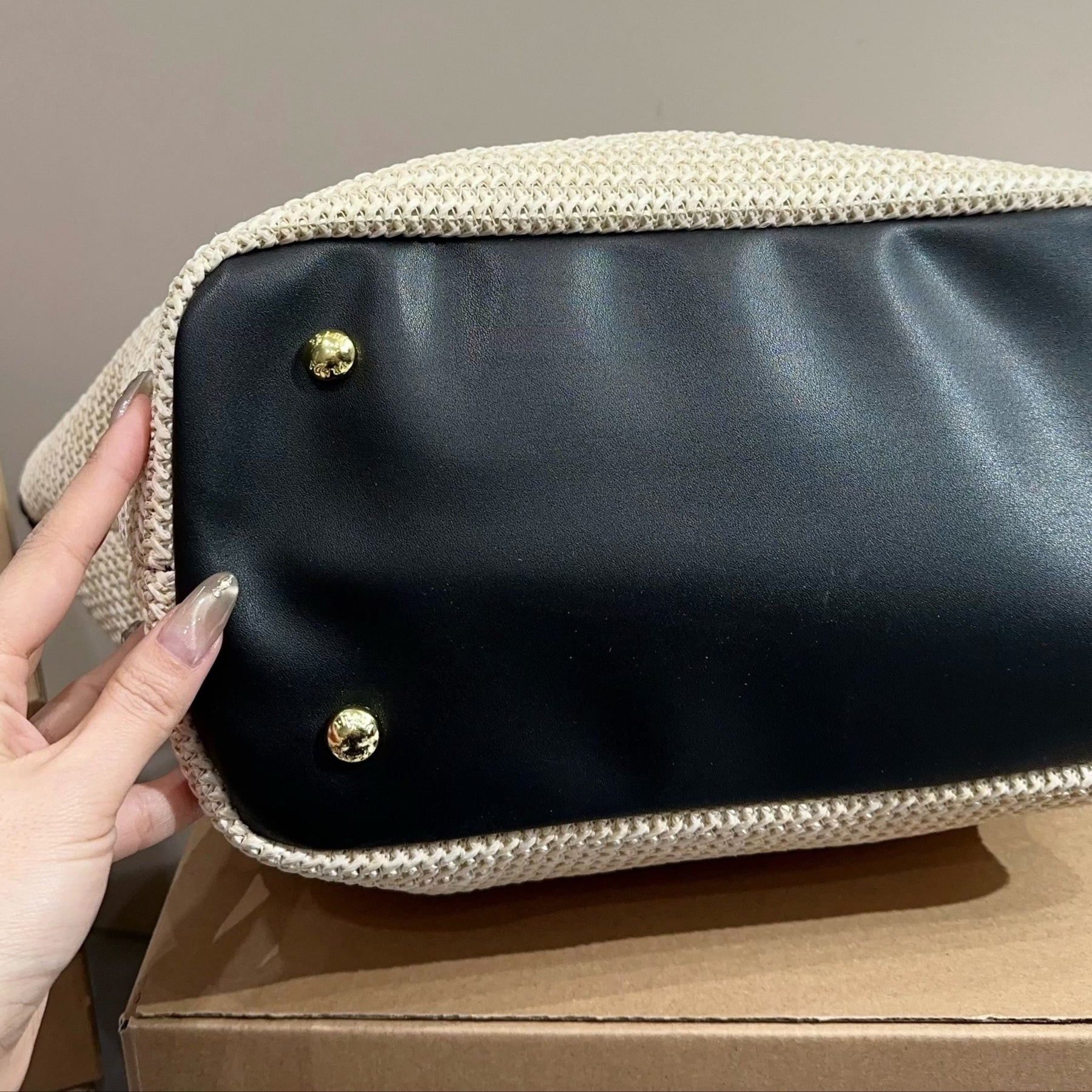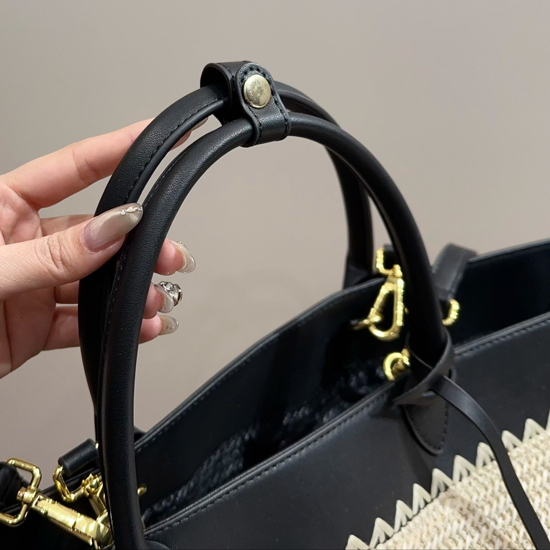 CROCHET TOTE BAG 32 IN BEIGE WOVEN RAFFIA WITH BLACK CALFSKIN STRAP