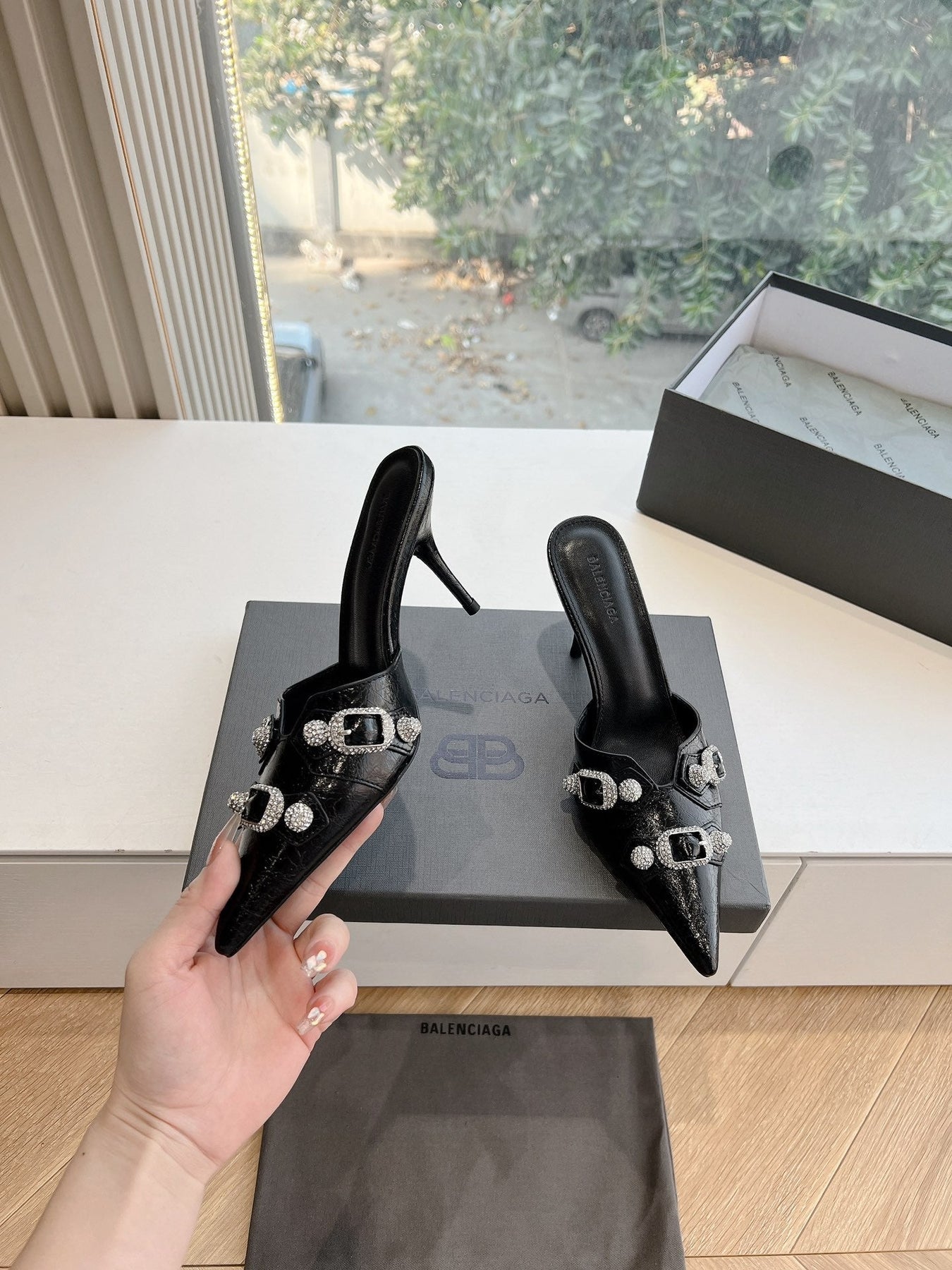 CRYSTAL BUCKLE BLACK WAX-OIL SHEEPSKIN HEELED MULES