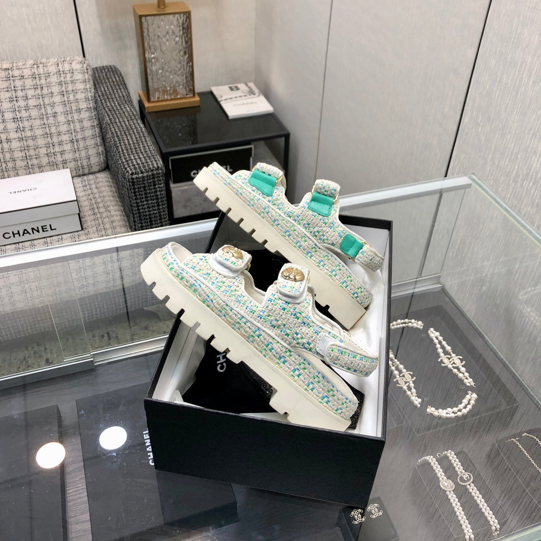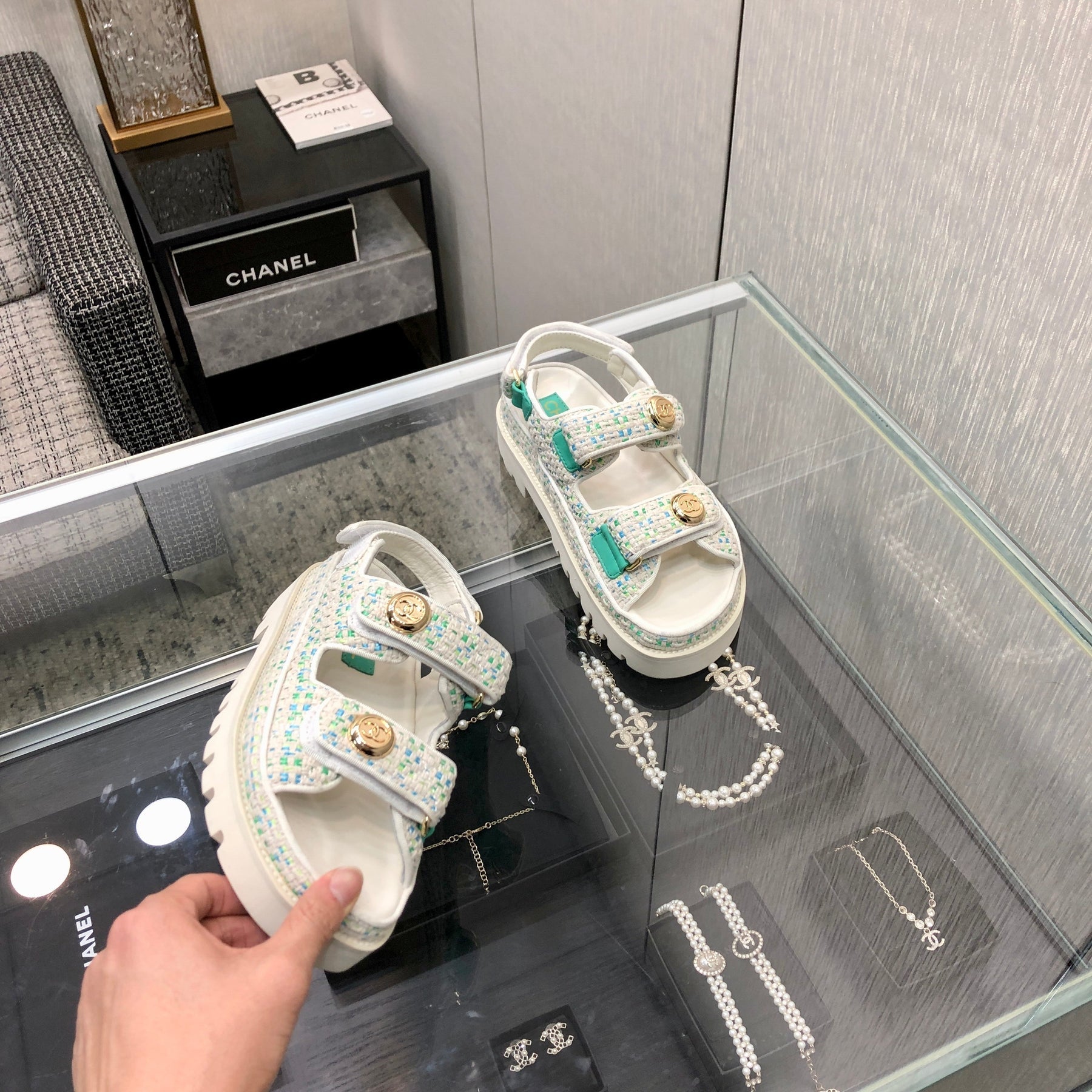 DAD SANDAL IN WHITE MIX PERSIAN GREEN TWEED FABRIC
