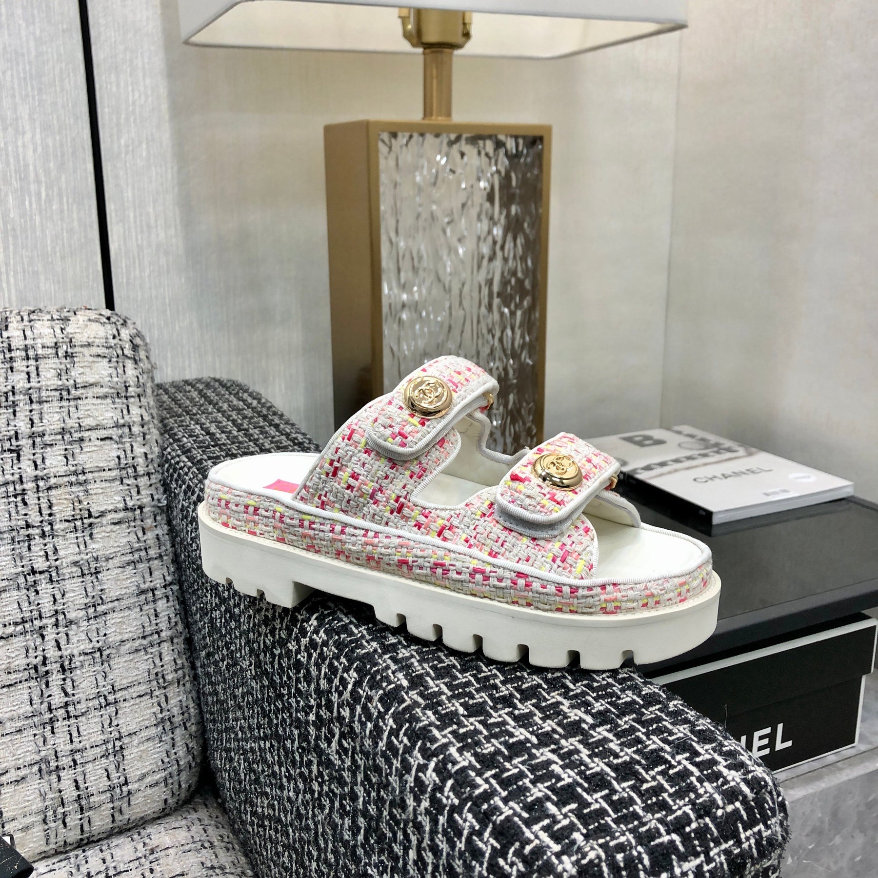 DAD SANDAL MULE IN WHITE MIX BRIGHT PINK TWEED FABRIC