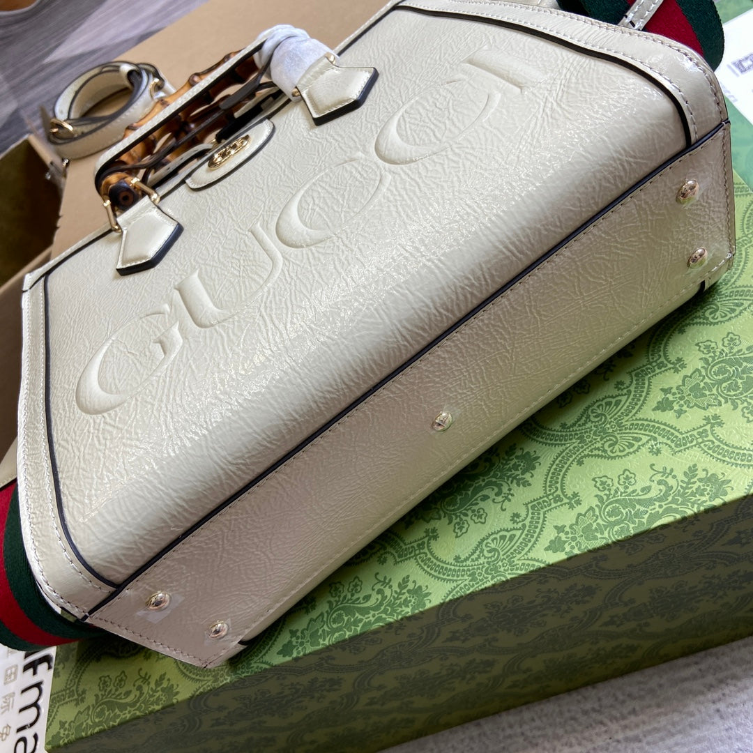 DIANA SMALL TOTE BAG 27 WITH WEB IN WHITE LACQUER CALFSKIN BAMBOO HANDLE