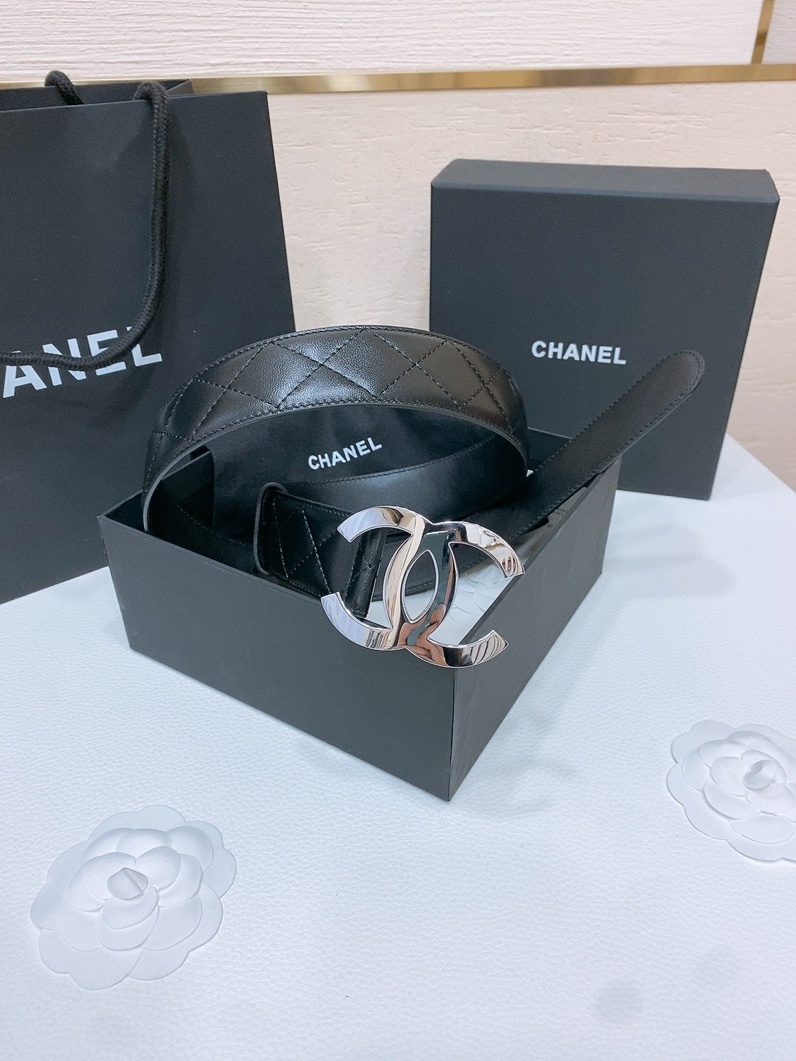 DOUBLE C 38MM IN BLACK QUILTED LAMBSKIN SILVER BUCKLE
