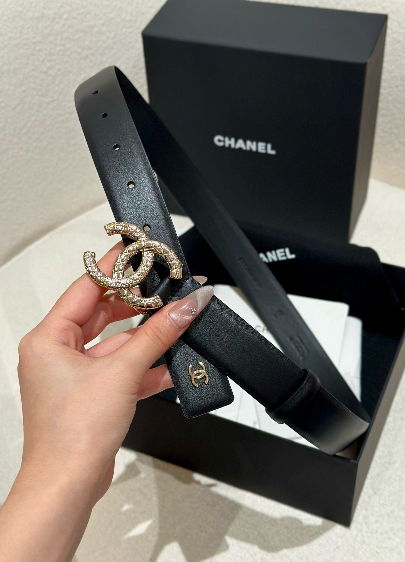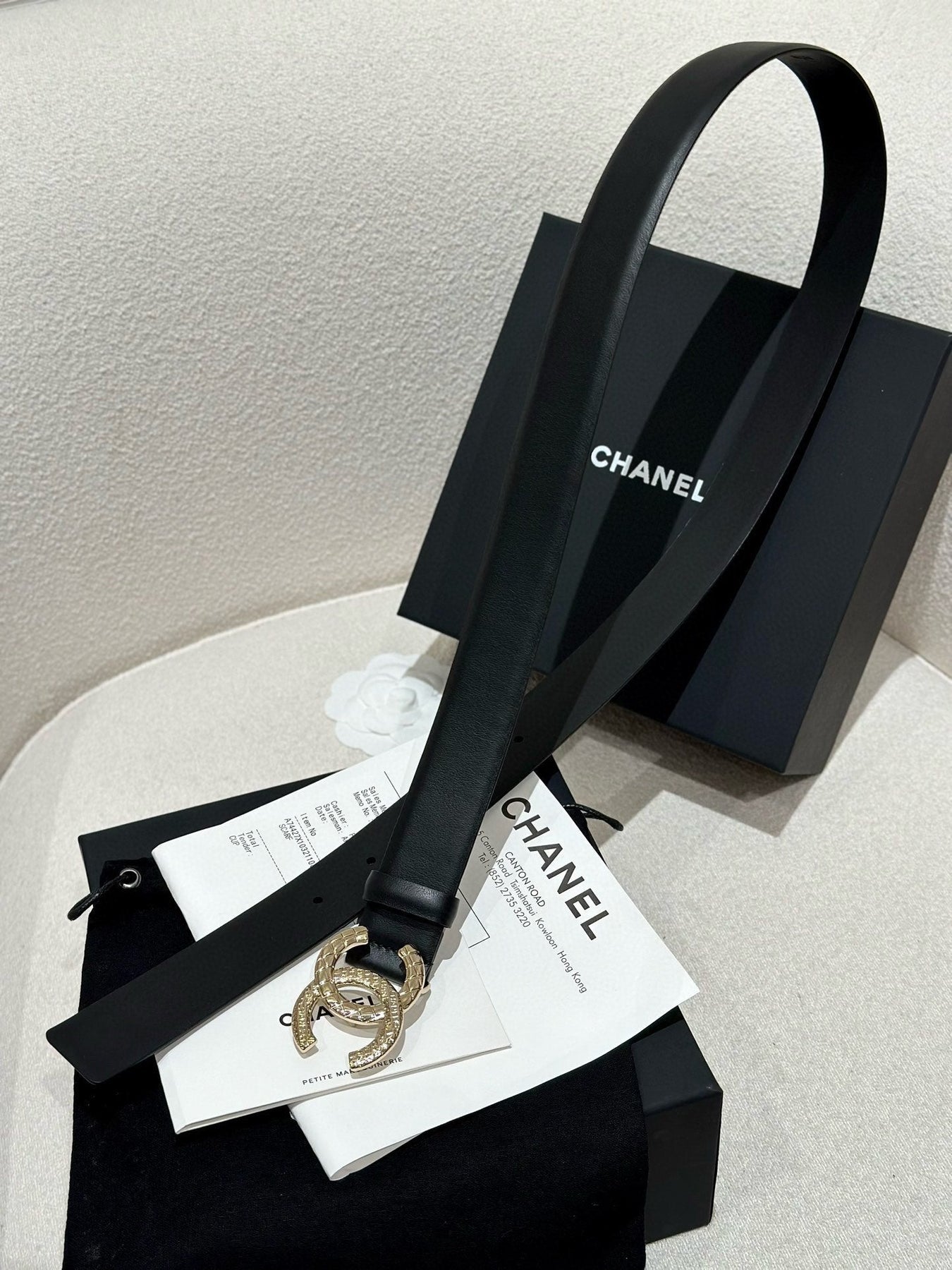 DOUBLE C BELT 30MM IN BLACK CALFSKIN WITH GOLD HARDWARE AND CARO STITCHING