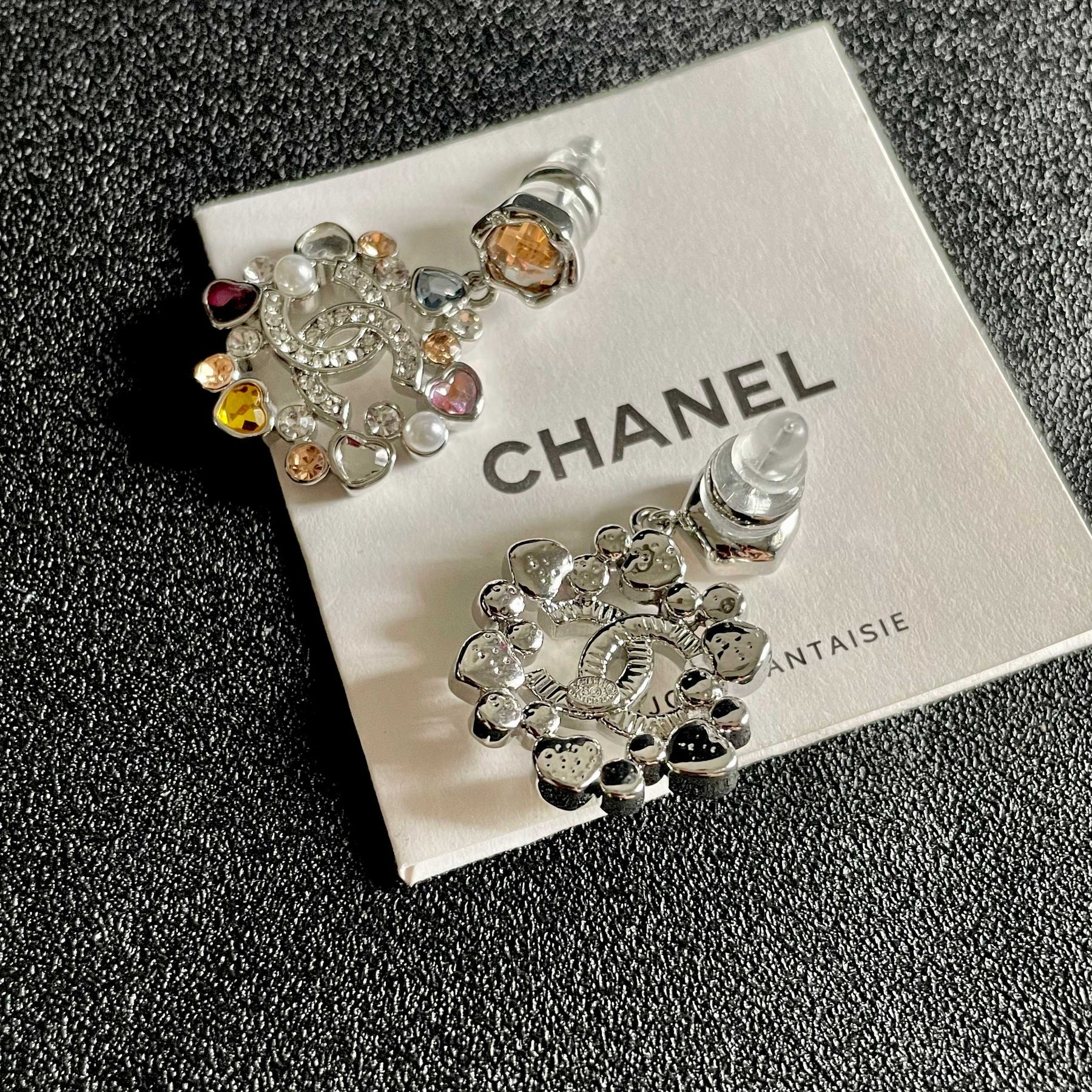 DOUBLE C STUD EARRINGS IN SILVER METAL WHITE PEARL MULTICOLOR STONES
