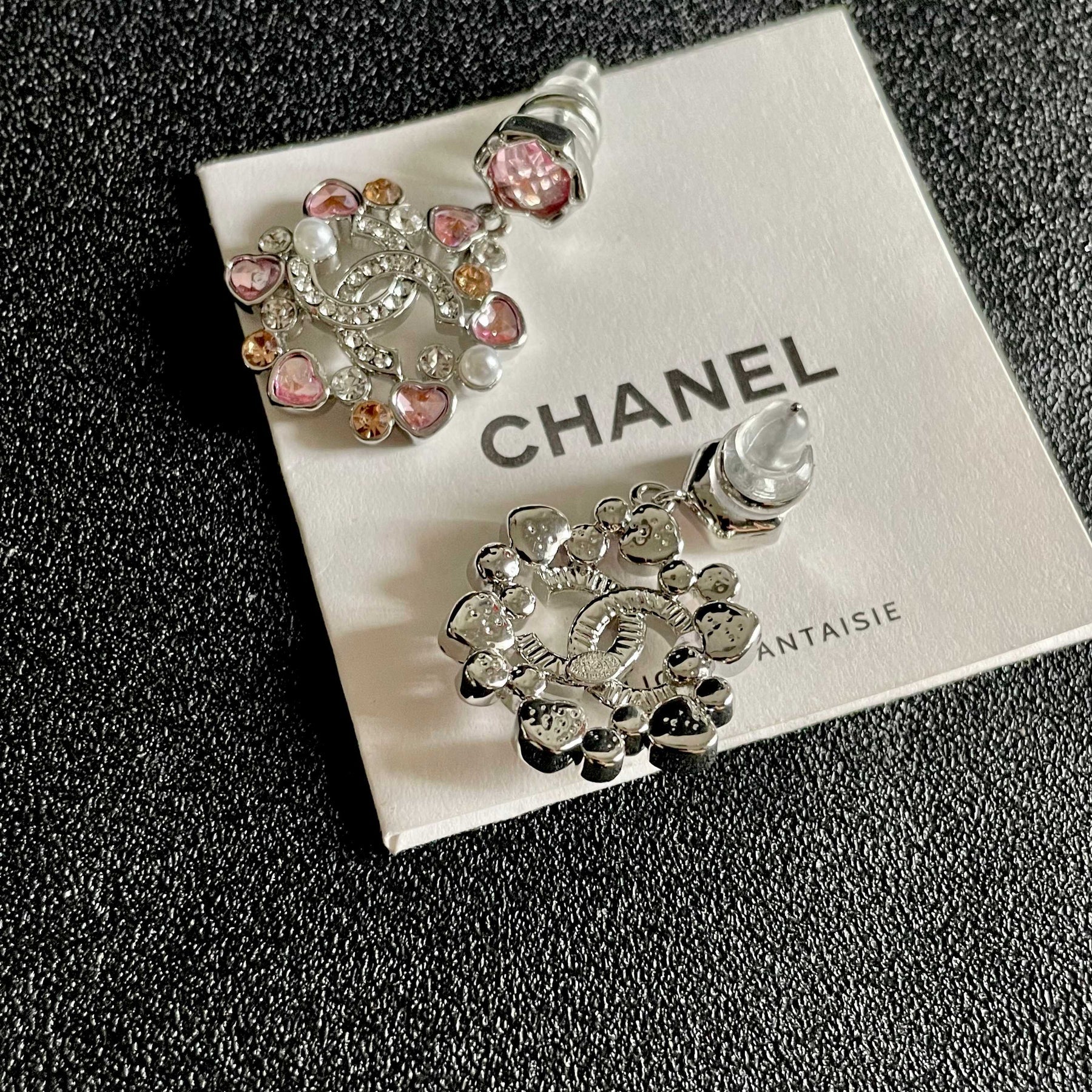 DOUBLE C STUD EARRINGS IN SILVER METAL WHITE & PINK STONES