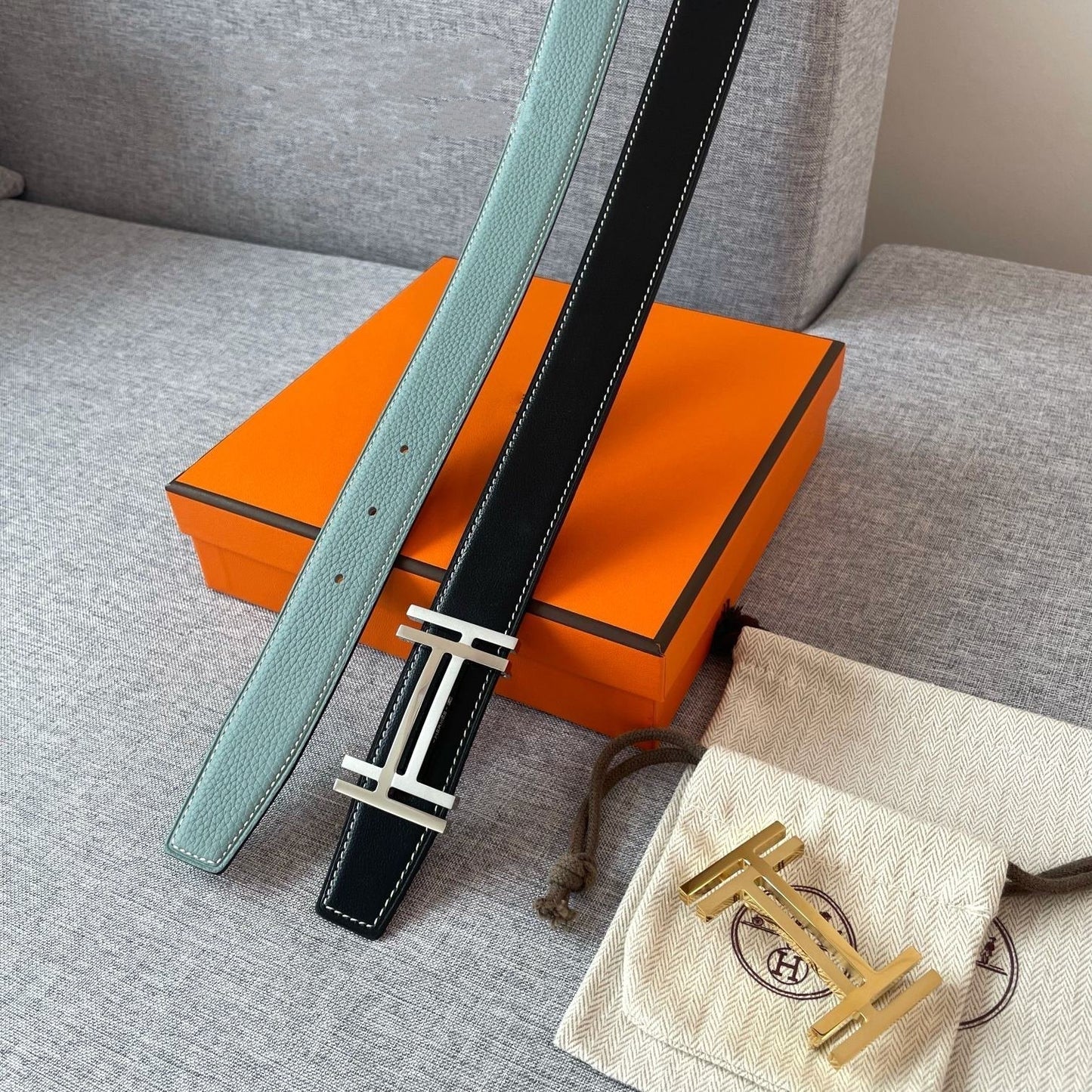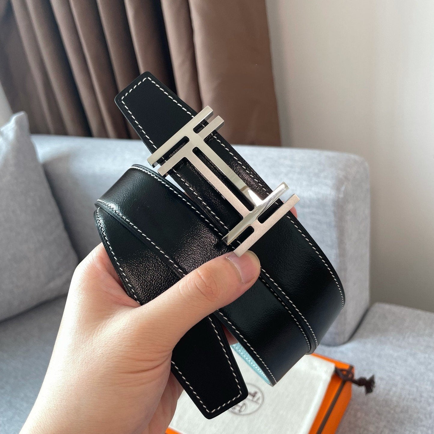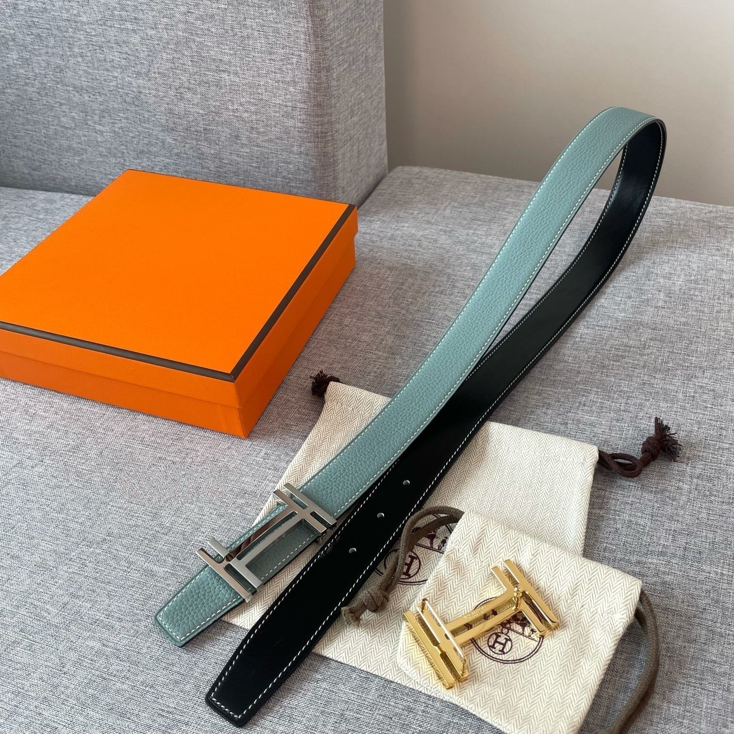 DOUBLE H REVERSIBLE BELT 32MM SILVER BUCKLE BLACK SKY BLUE LEATHER