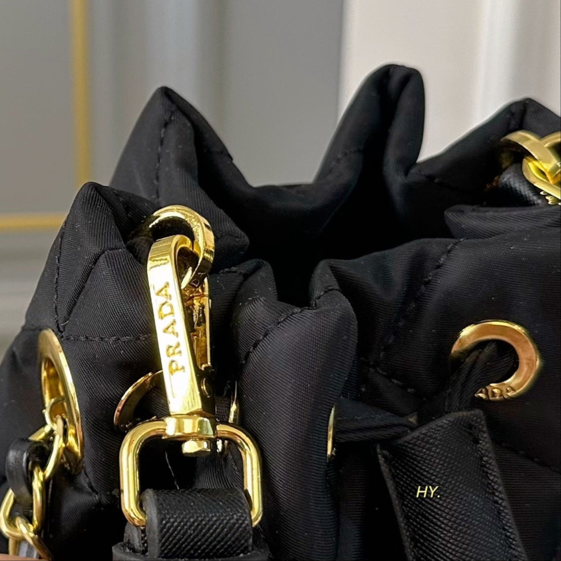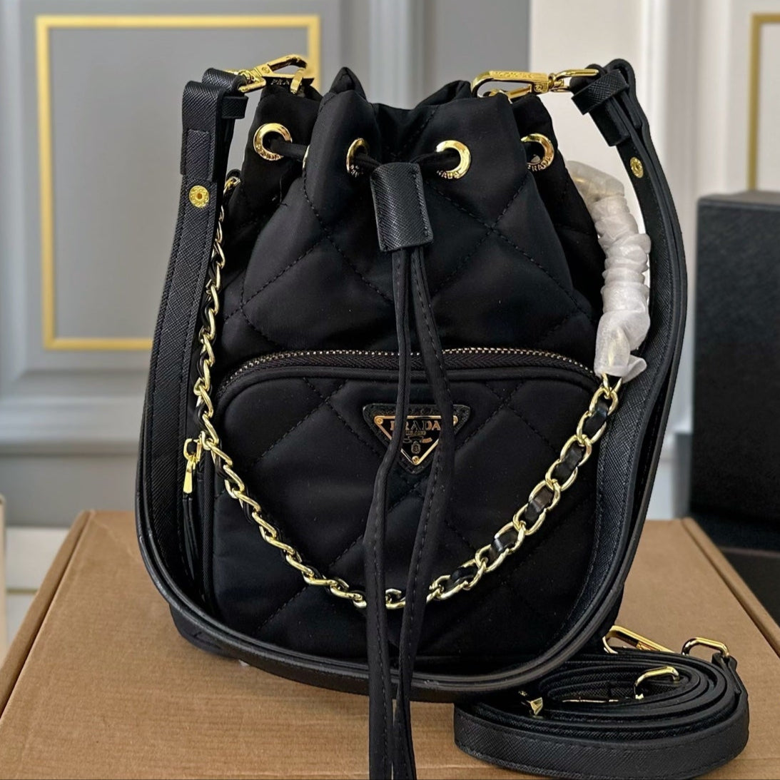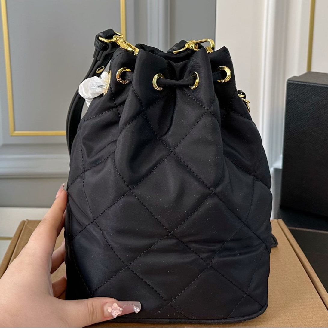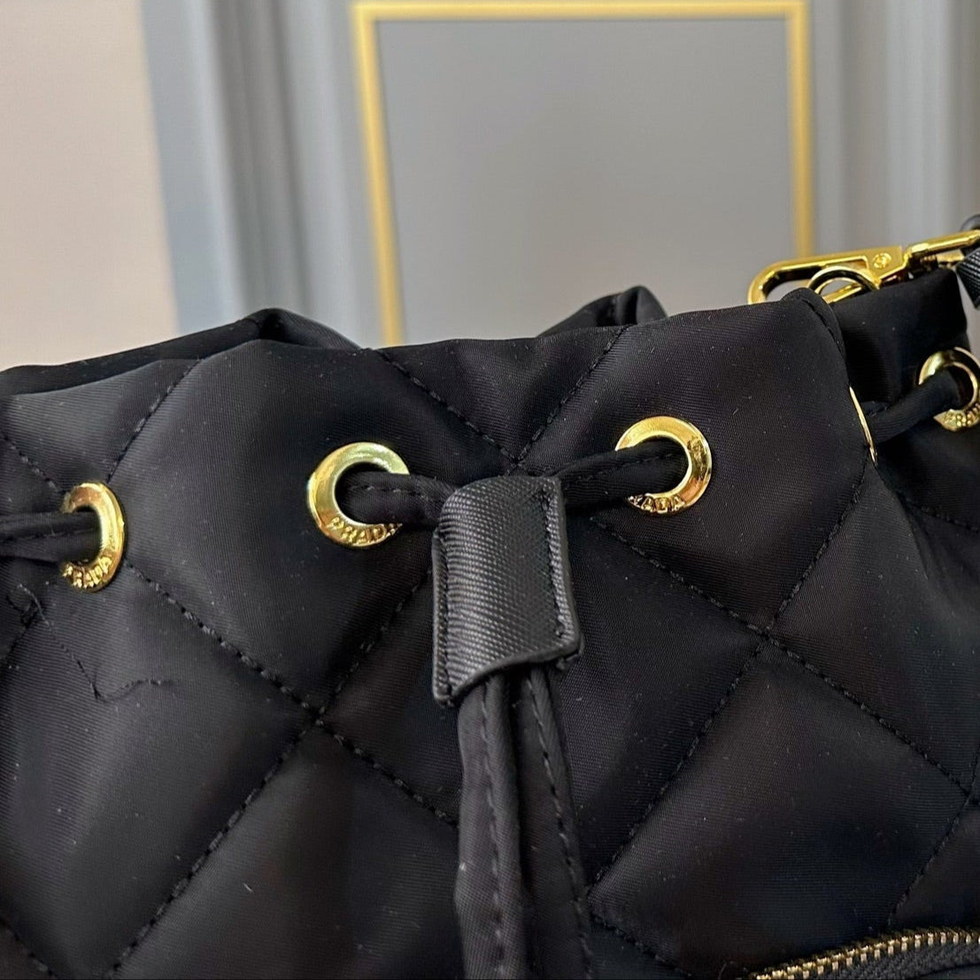 DRAWSTRING BUCKET BAG 23 IN BLACK QUILTED RE-NYLON