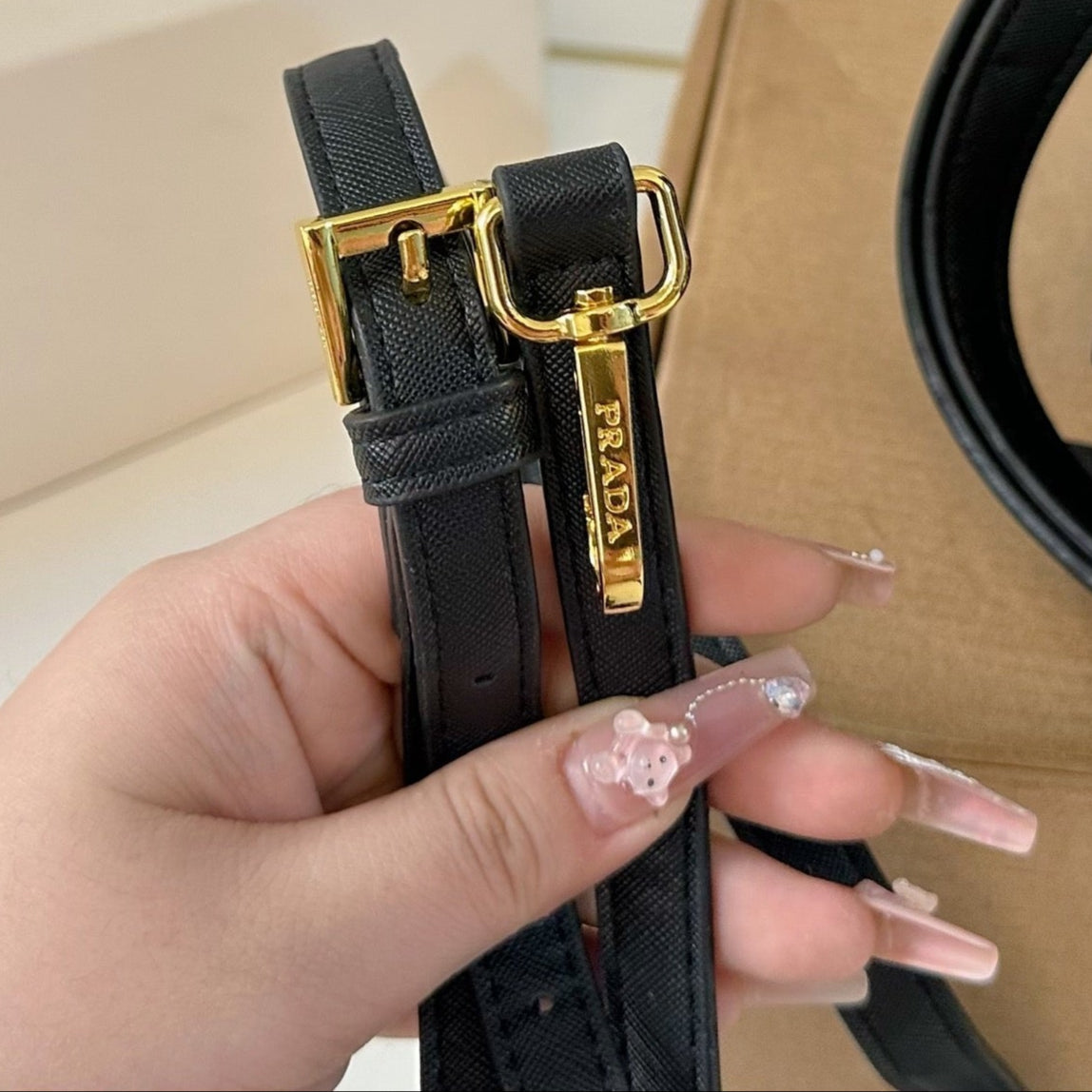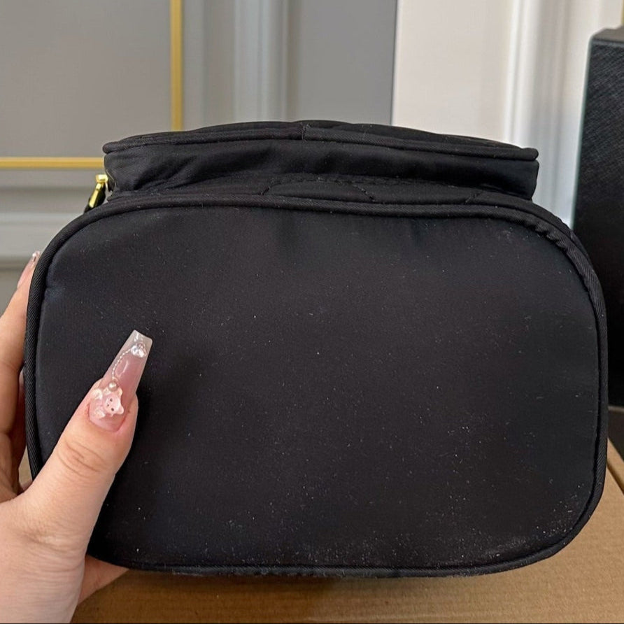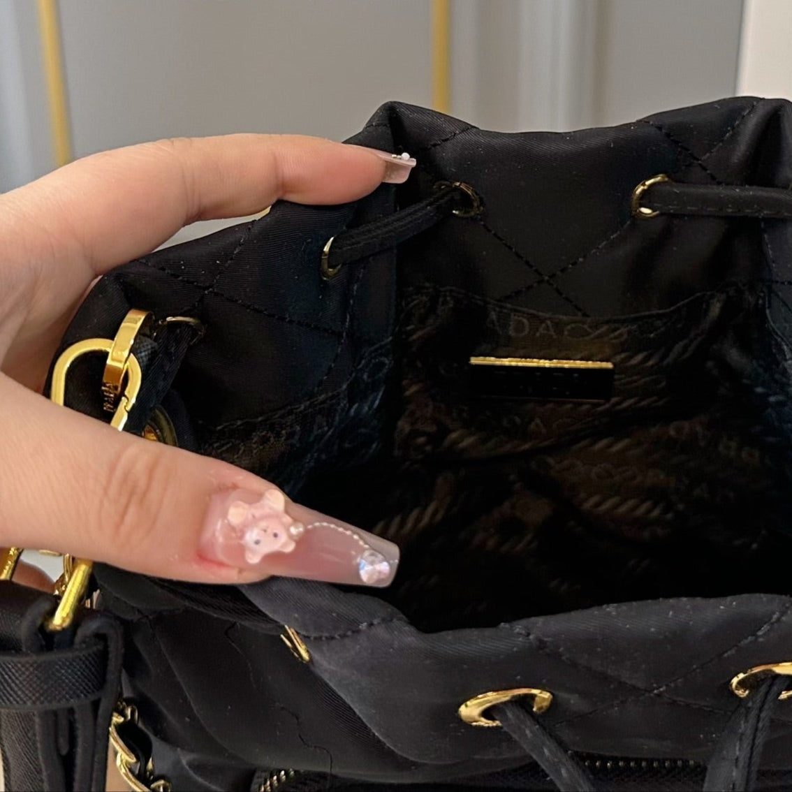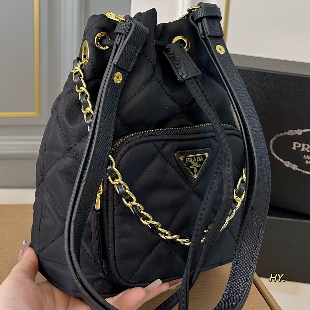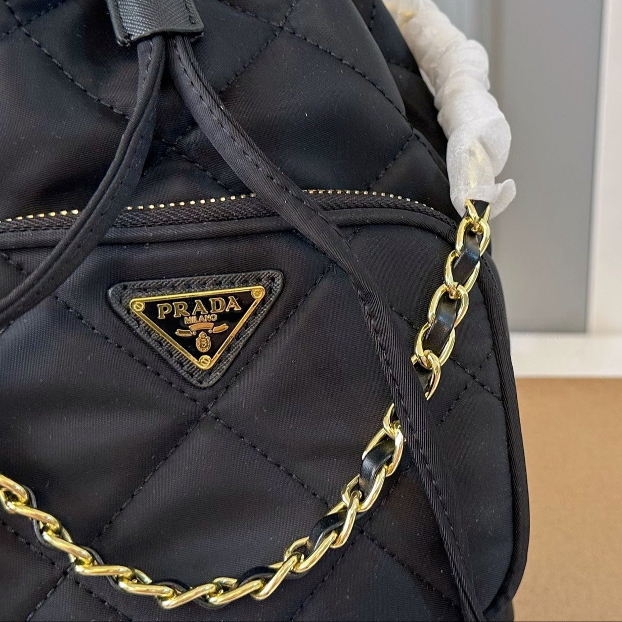DRAWSTRING BUCKET BAG 23 IN BLACK QUILTED RE-NYLON