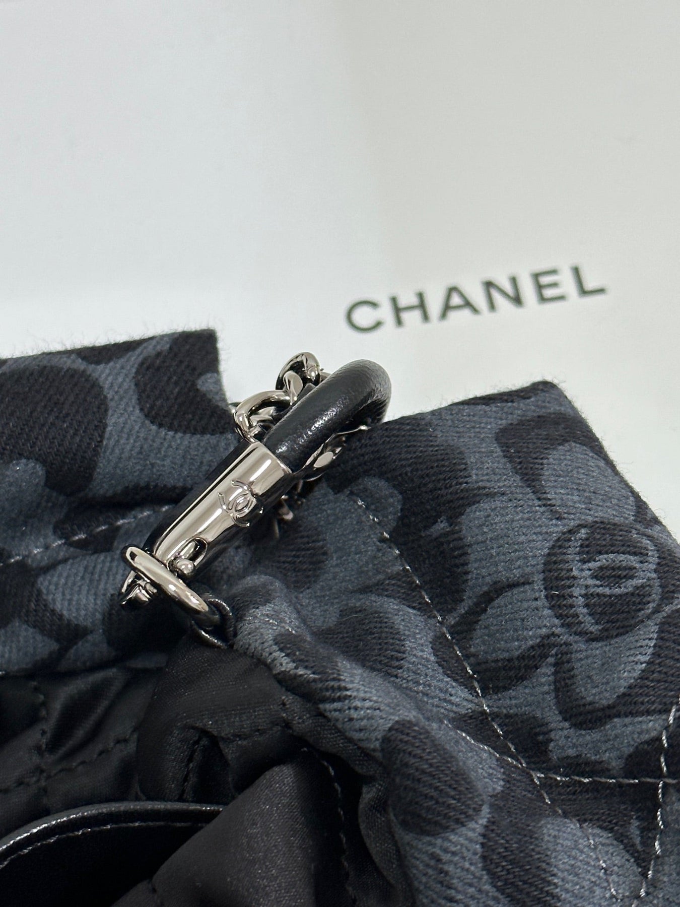 DRAWSTRING FLORAL PRINT SHOULDER BAG 20 IN BLACK MIX GREY DENIM