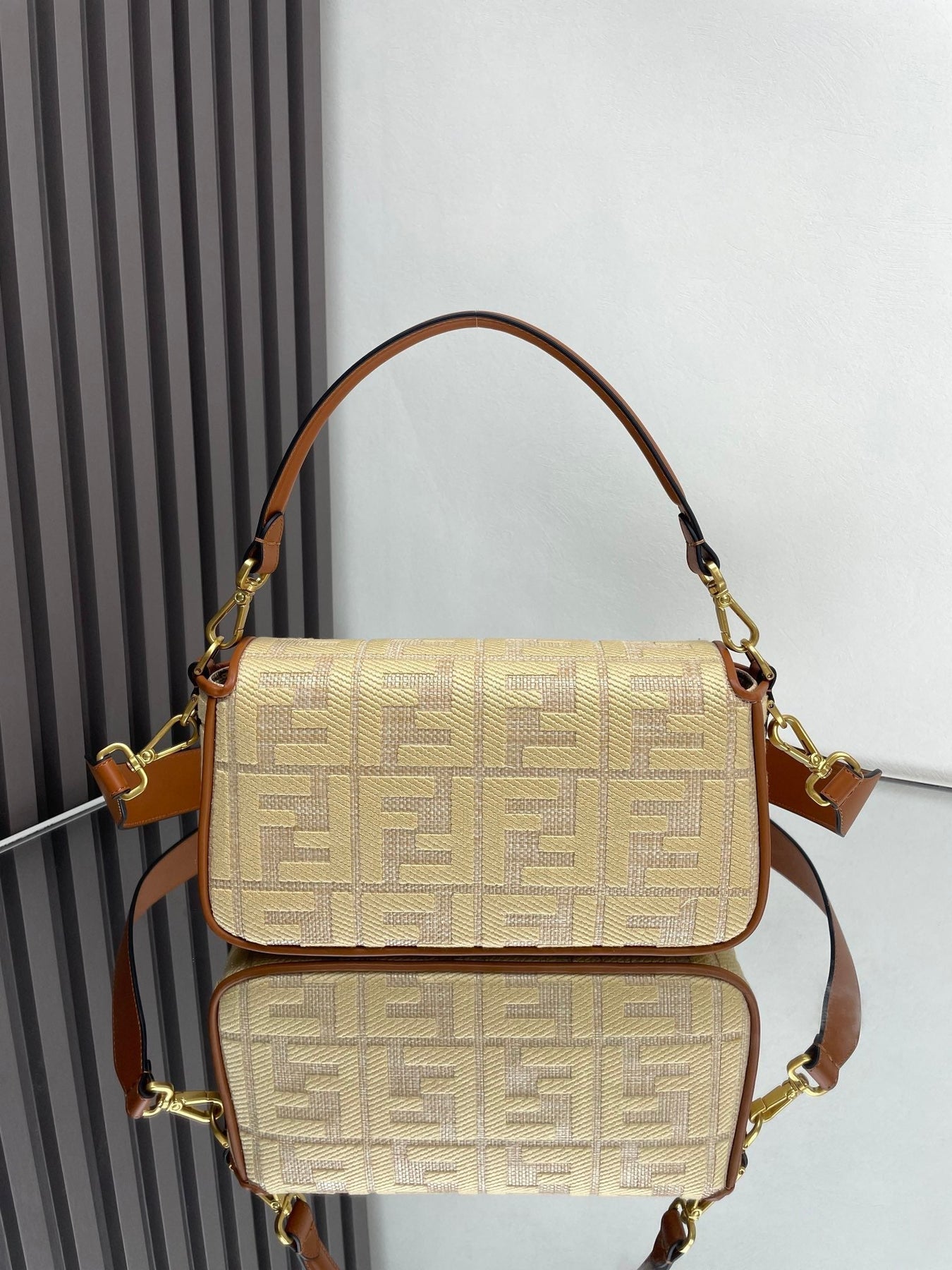 Fend Baguette Gold Tan Canvas Bag 27 with FF Embroidery Ghw