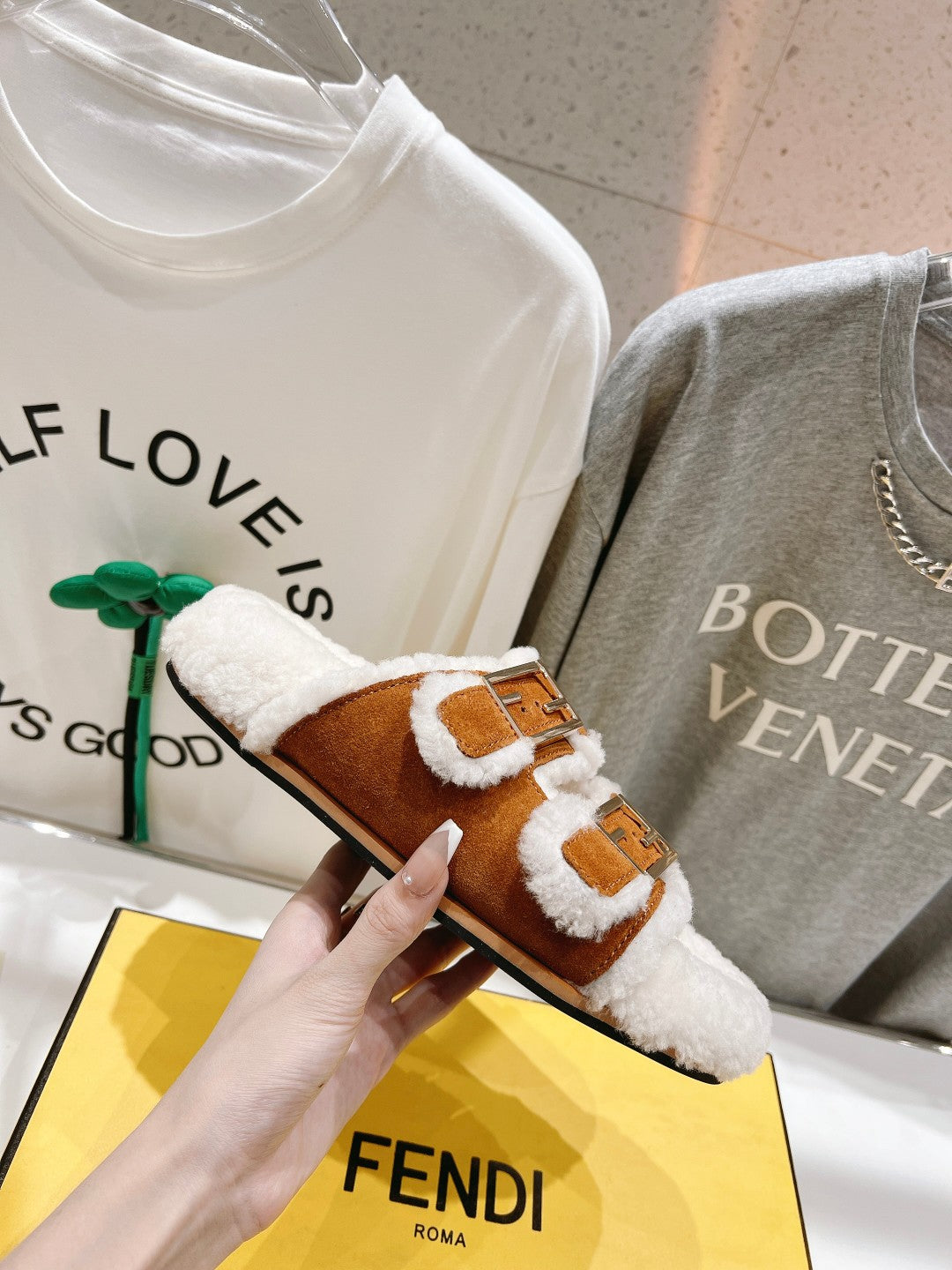 FENDI DAD SANDAL MULE IN BRONZE BROWN SUEDE WITH WHITE FLEECE