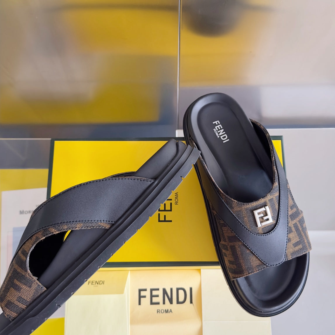 FENDI DIAGONAL ONE-STRAP SLIDE IN BLACK MIX BROWN MONOGRAM CALFSKIN