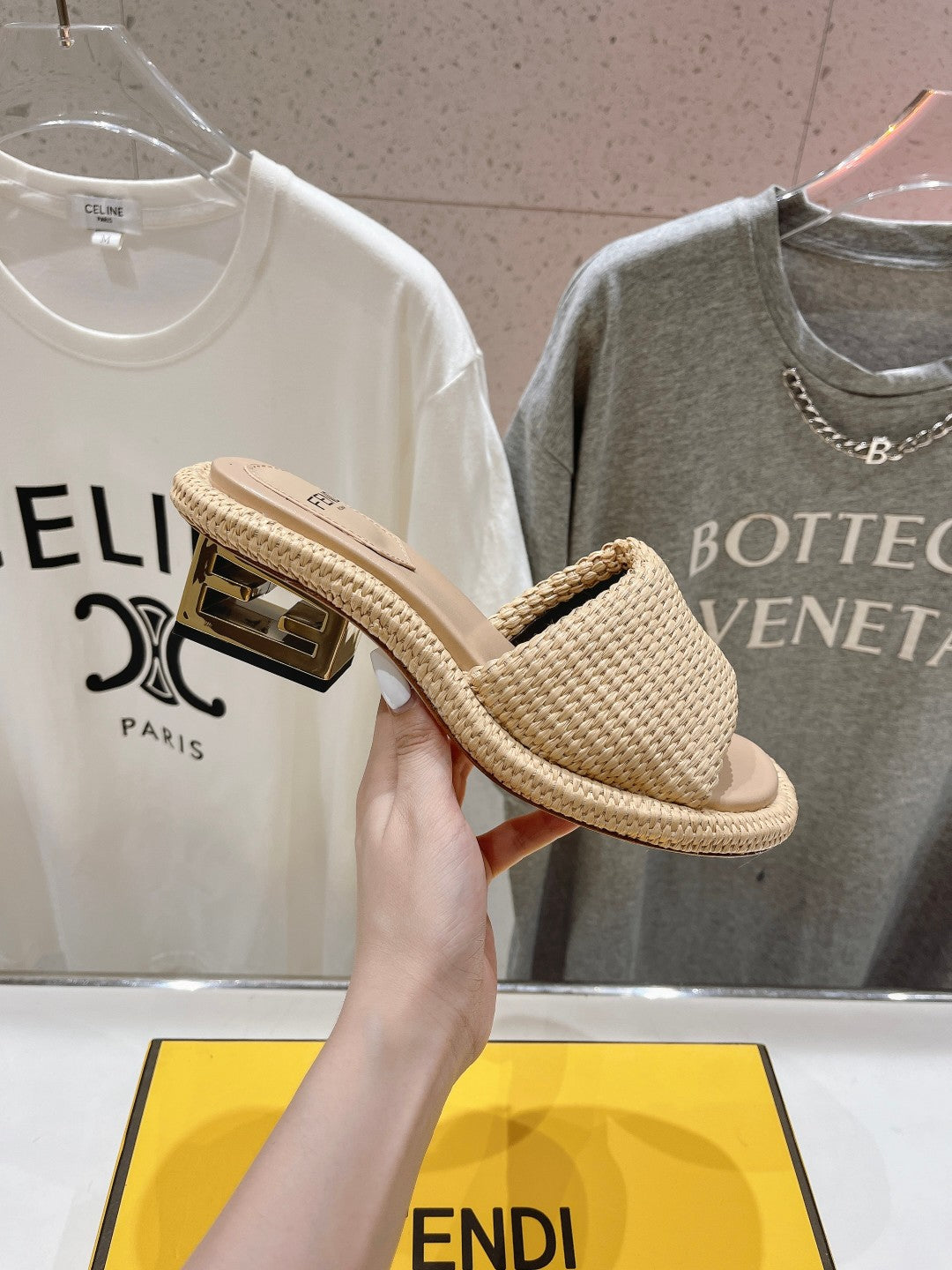 FENDI FFOLD MEDIUM-HEEL SANDALS 45 MM IN TUSCAN BEIGE COTTON FIBRE