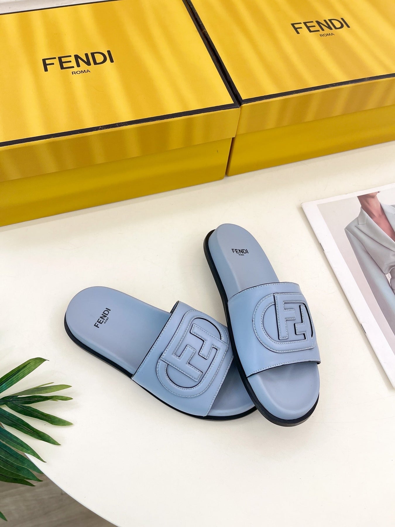 FENDI LOGO SLIDES IN BLUE POWDER CALFSKIN