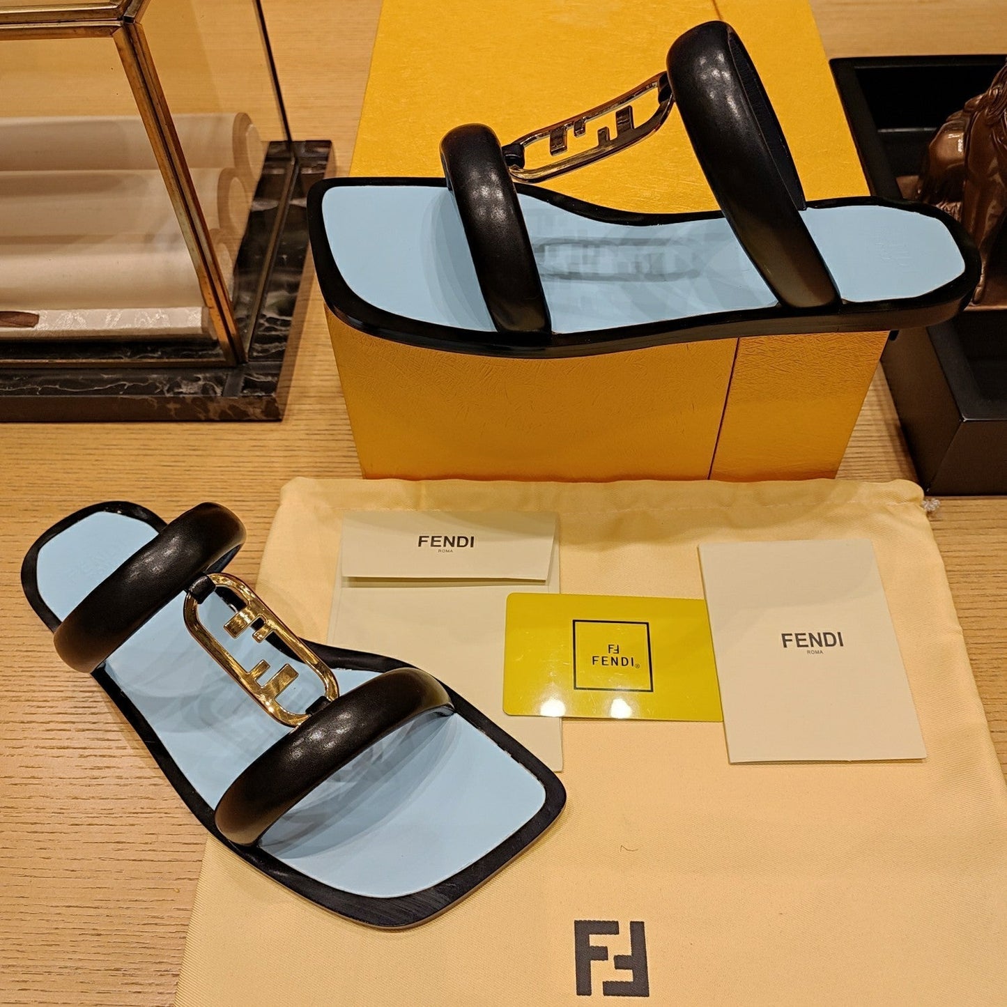 FENDI O'LOCK SLIDES BLACK AND LIGHT BLUE CALFSKIN WITH GOLD HARDWARE