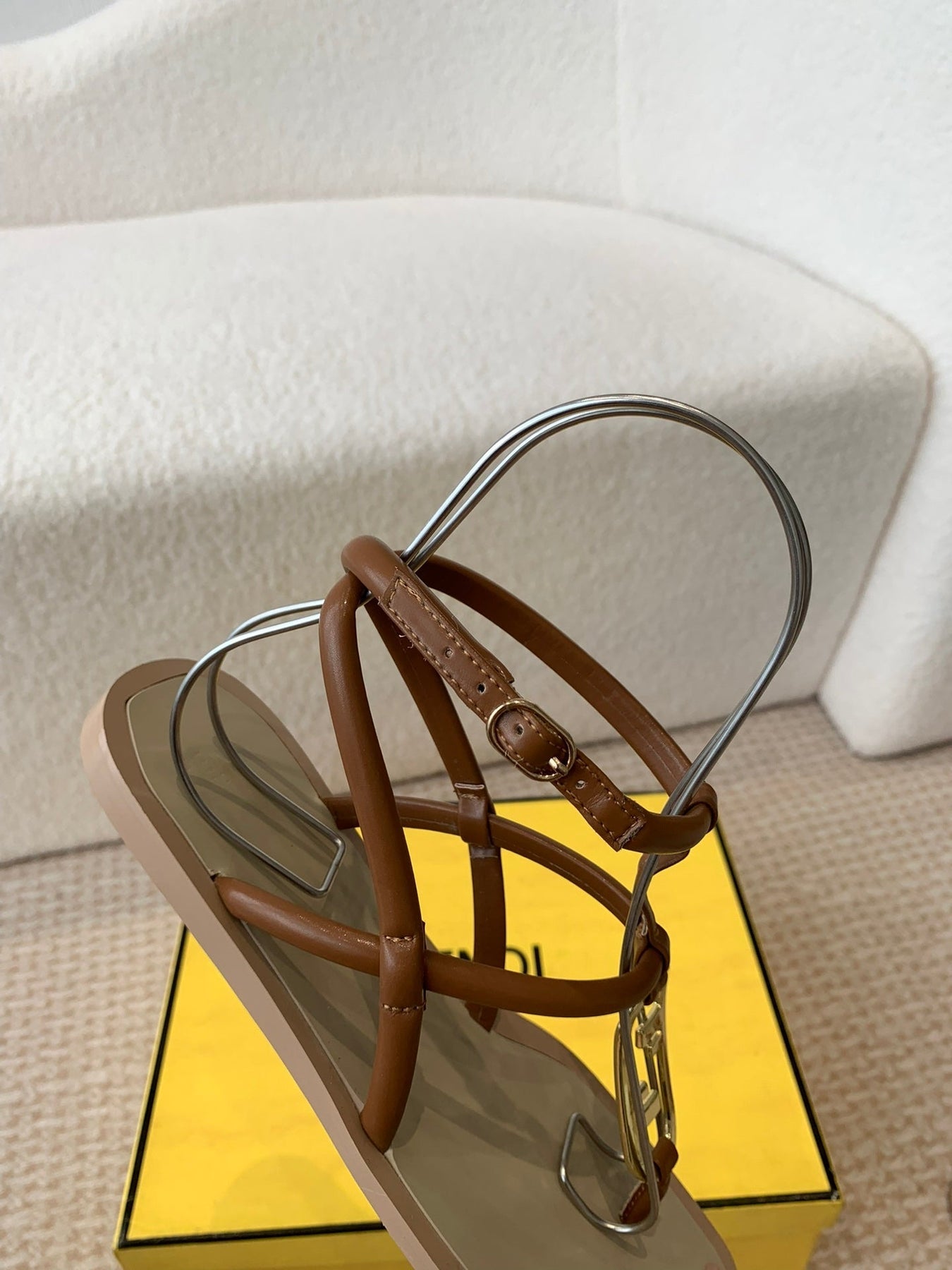 FENDI O'LOCK THONG SANDAL BROWN CALFSKIN WITH GOLD HARDWARE