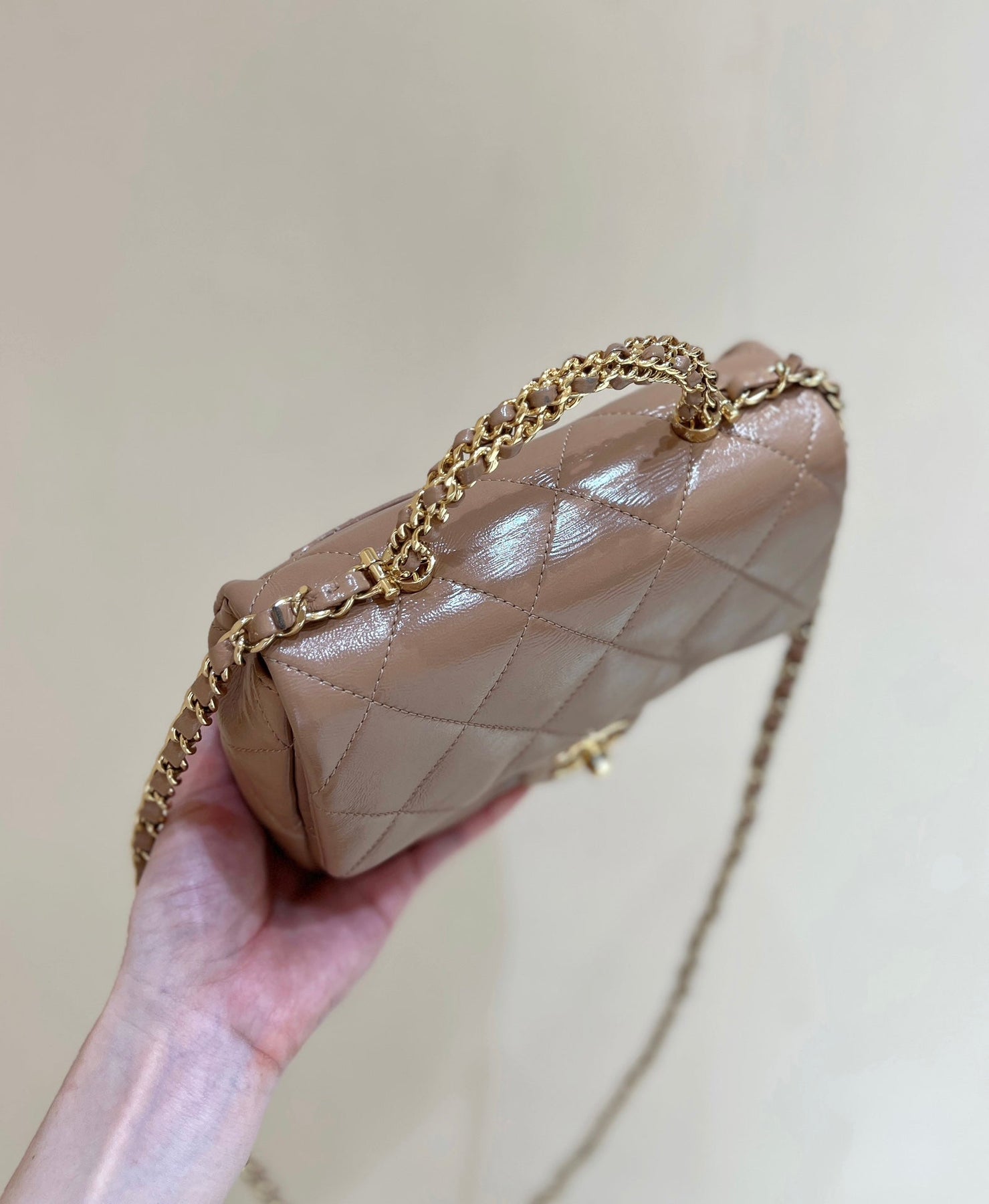 FLAP BAG WITH TOP HANDLE 19 IN BROWN LAMBSKIN GOLD HARDWARE