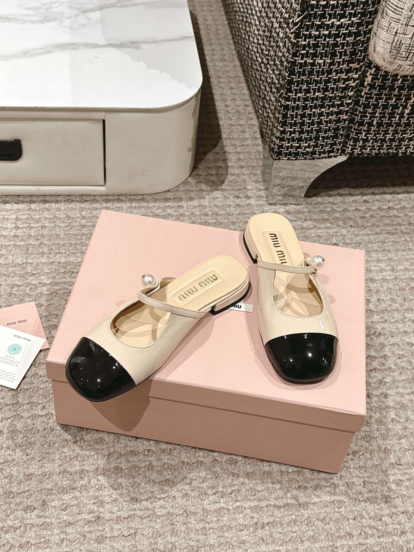 FLAT MULE IN BISQUE BEIGE MIX BLACK PATENT CALFSKIN