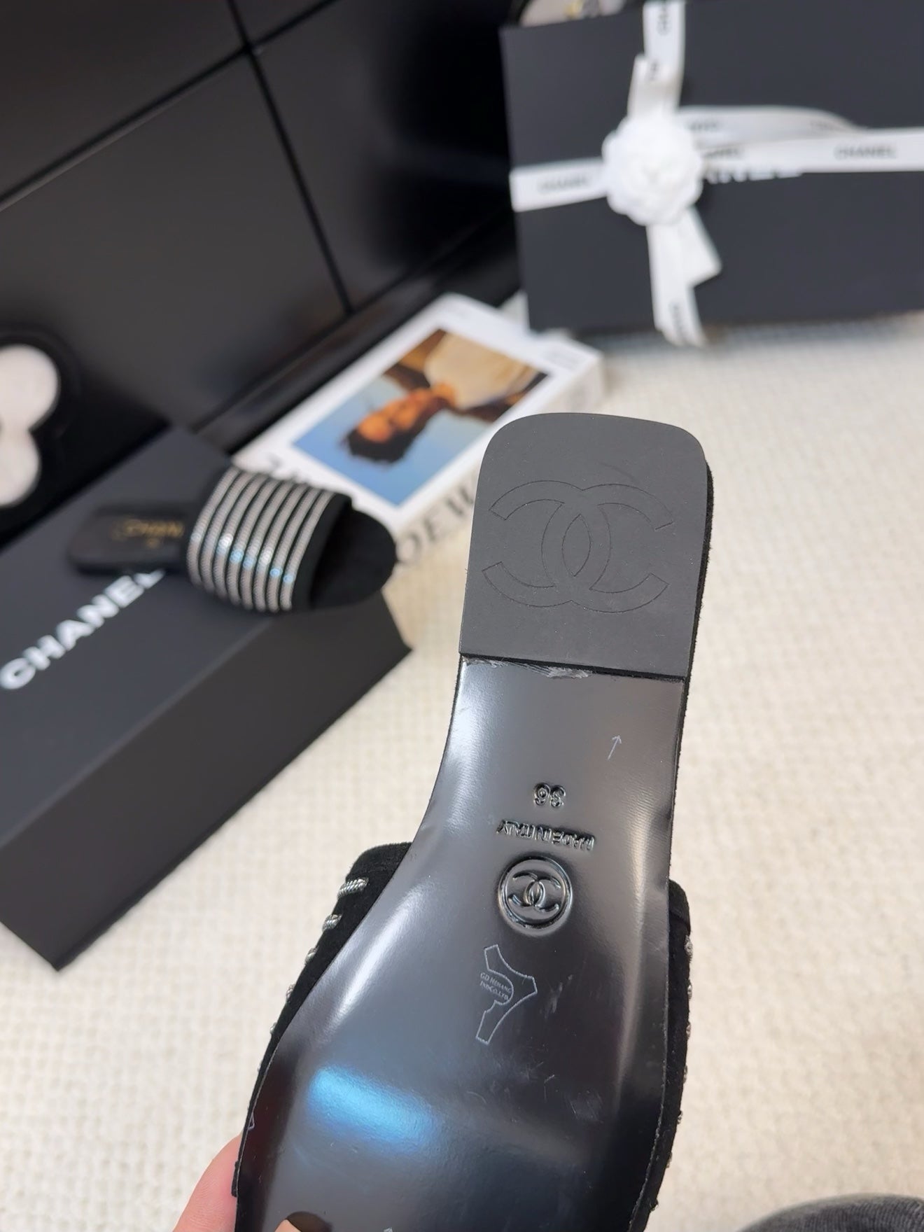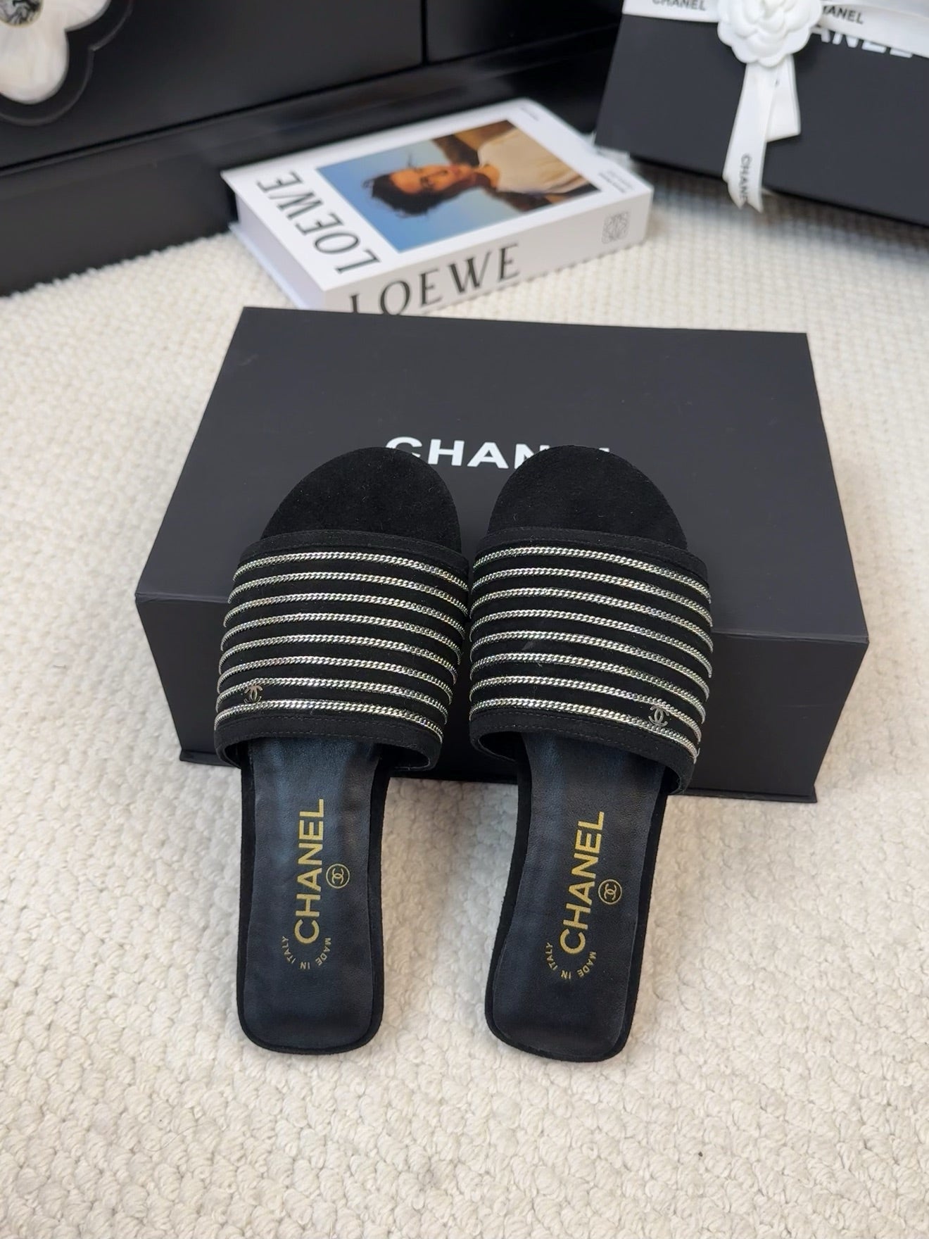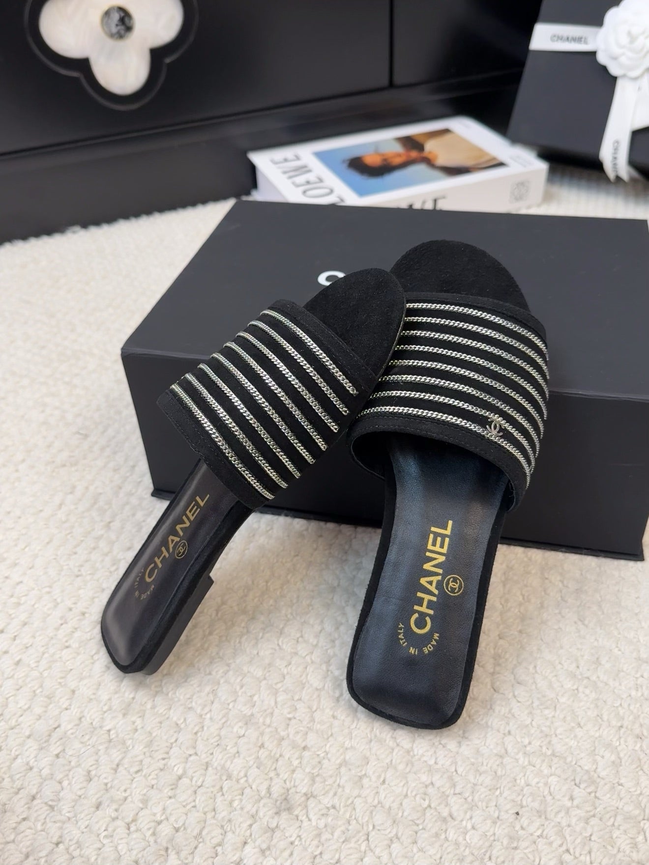 FLAT SLIDE IN BLACK SUEDE WITH SILVER CHAIN