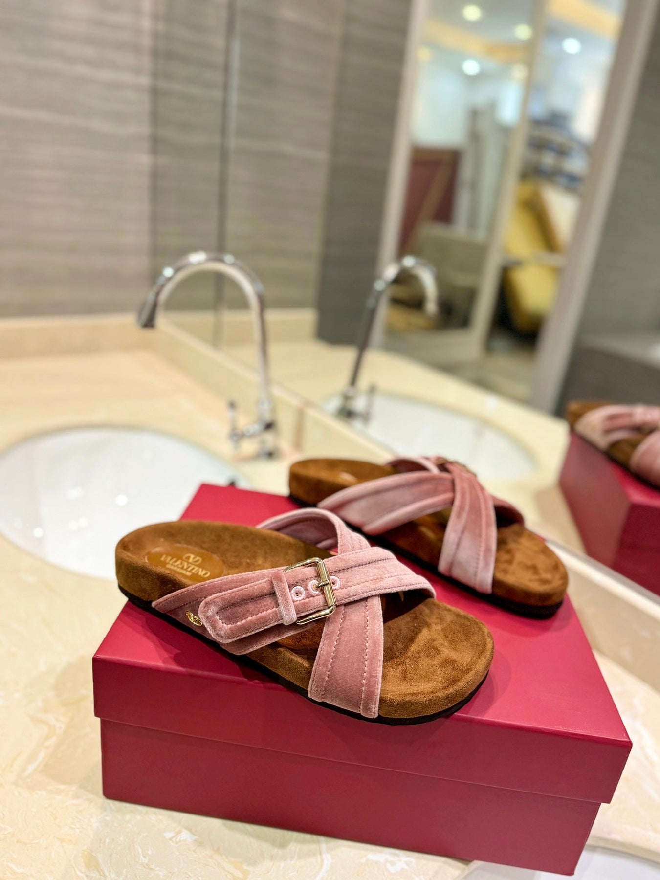 FUSSFRIEND CREPE PINK SILK VELVET SLIDE SANDALS