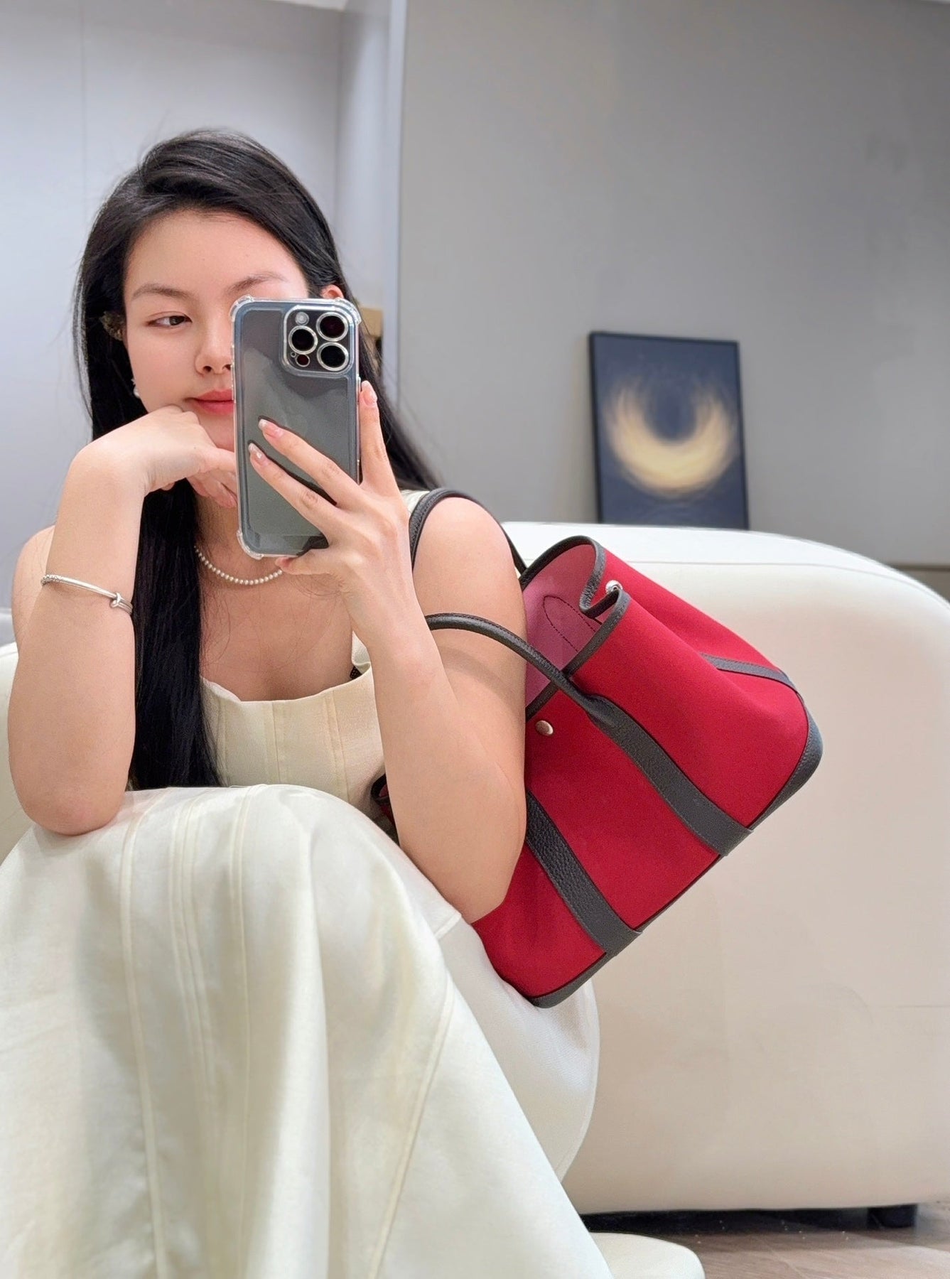 GARDEN PARTY 30CM IN RED TOILETS COTTON CANVAS AND DARK BROWN CALFSKIN PINK ON SIDE OTHER
