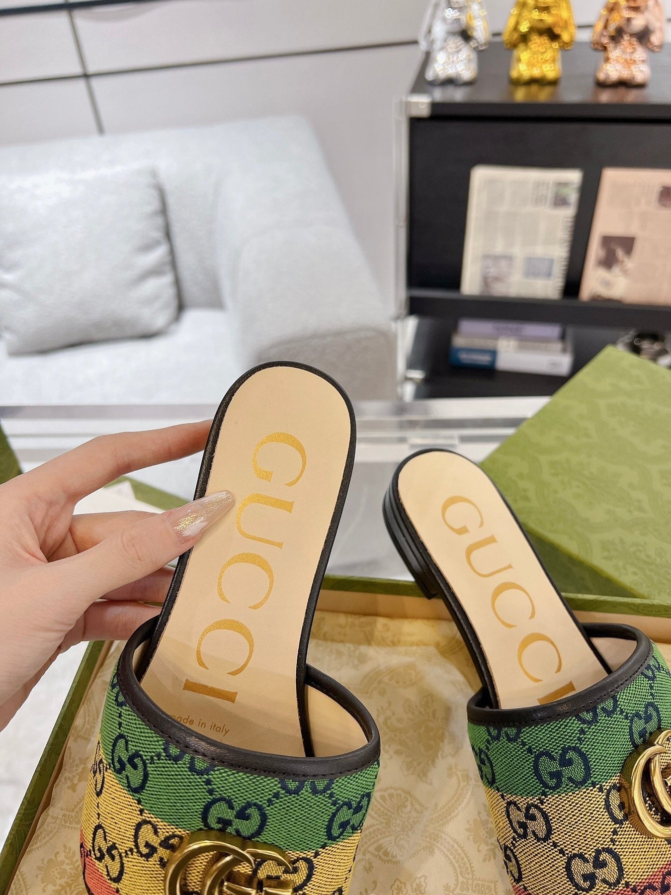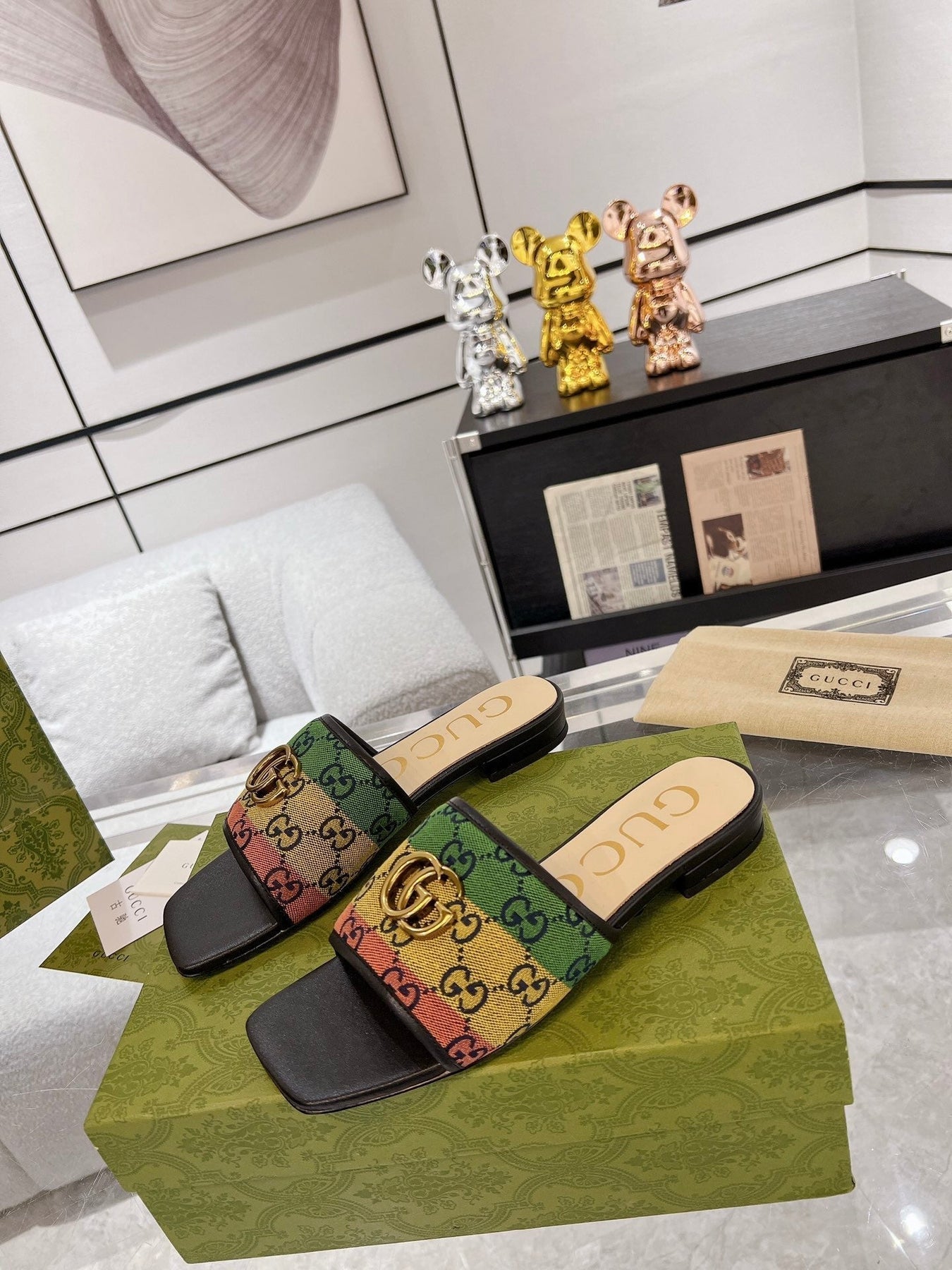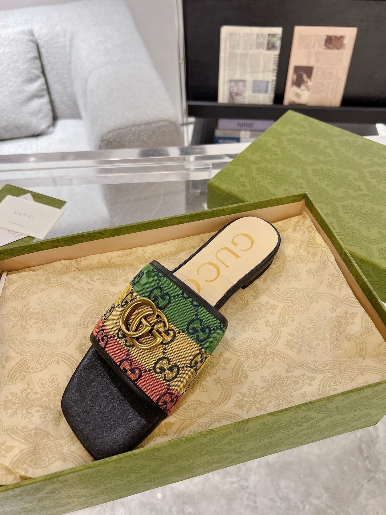 GG EXCLUSIVE SLIDE SANDAL BLACK AND CREAM FABRIC
