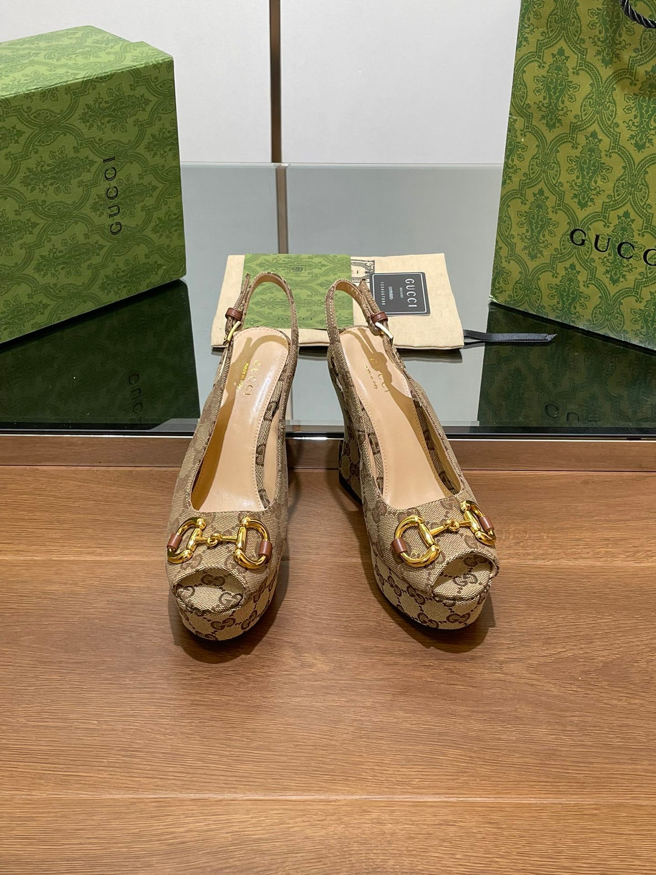 GG WEDGE PLATFORM IN CAMEL BROWN MONOGRAM JACQUARD FABRIC