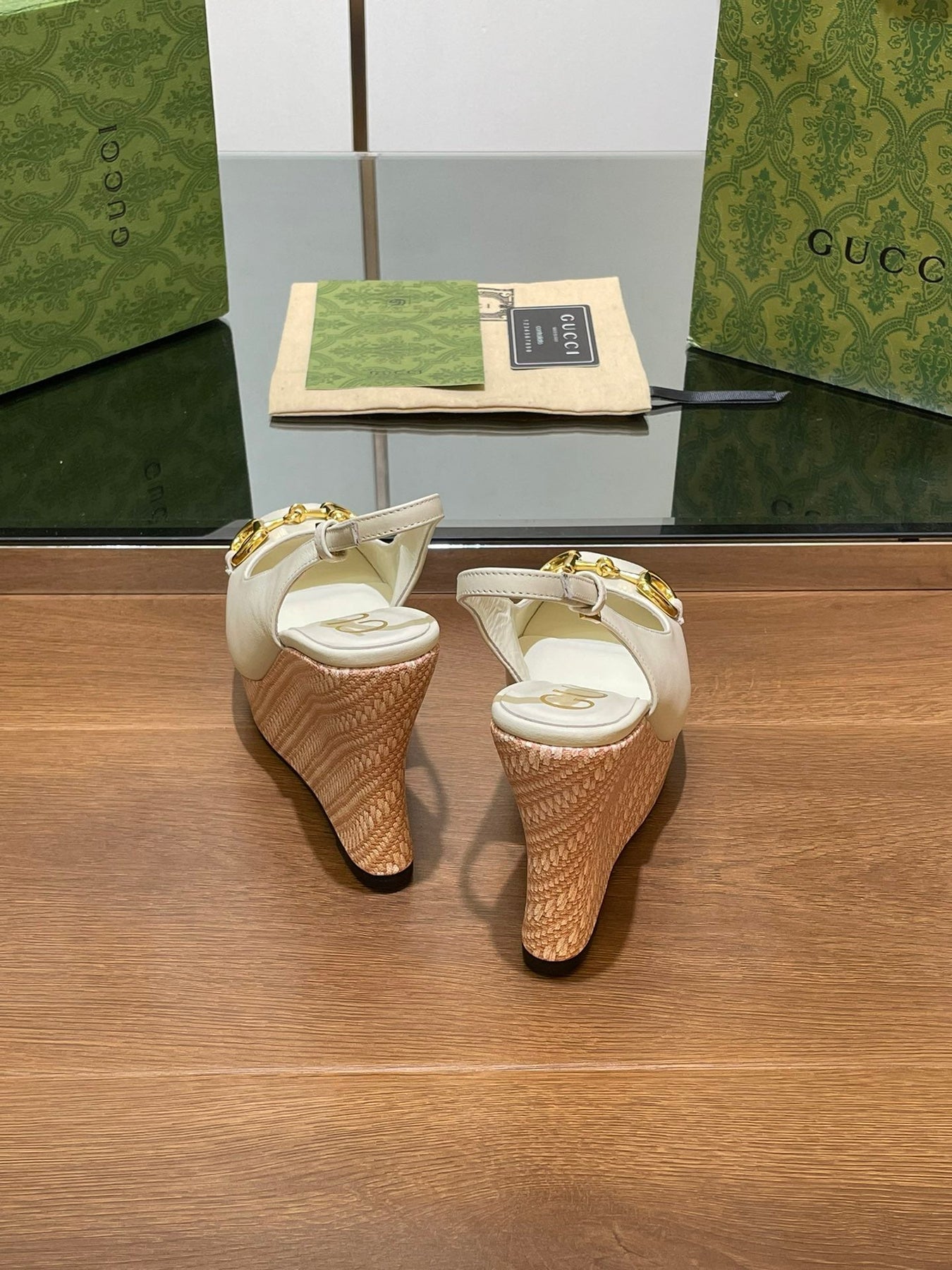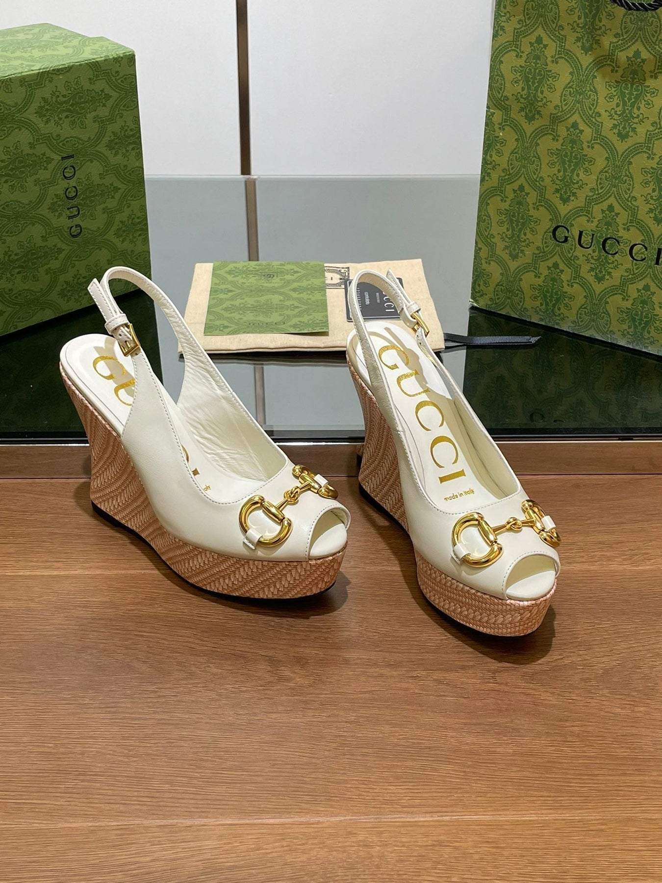 GG WEDGE PLATFORM IN WHITE CALFSKIN WITH GOLD HARDWARE