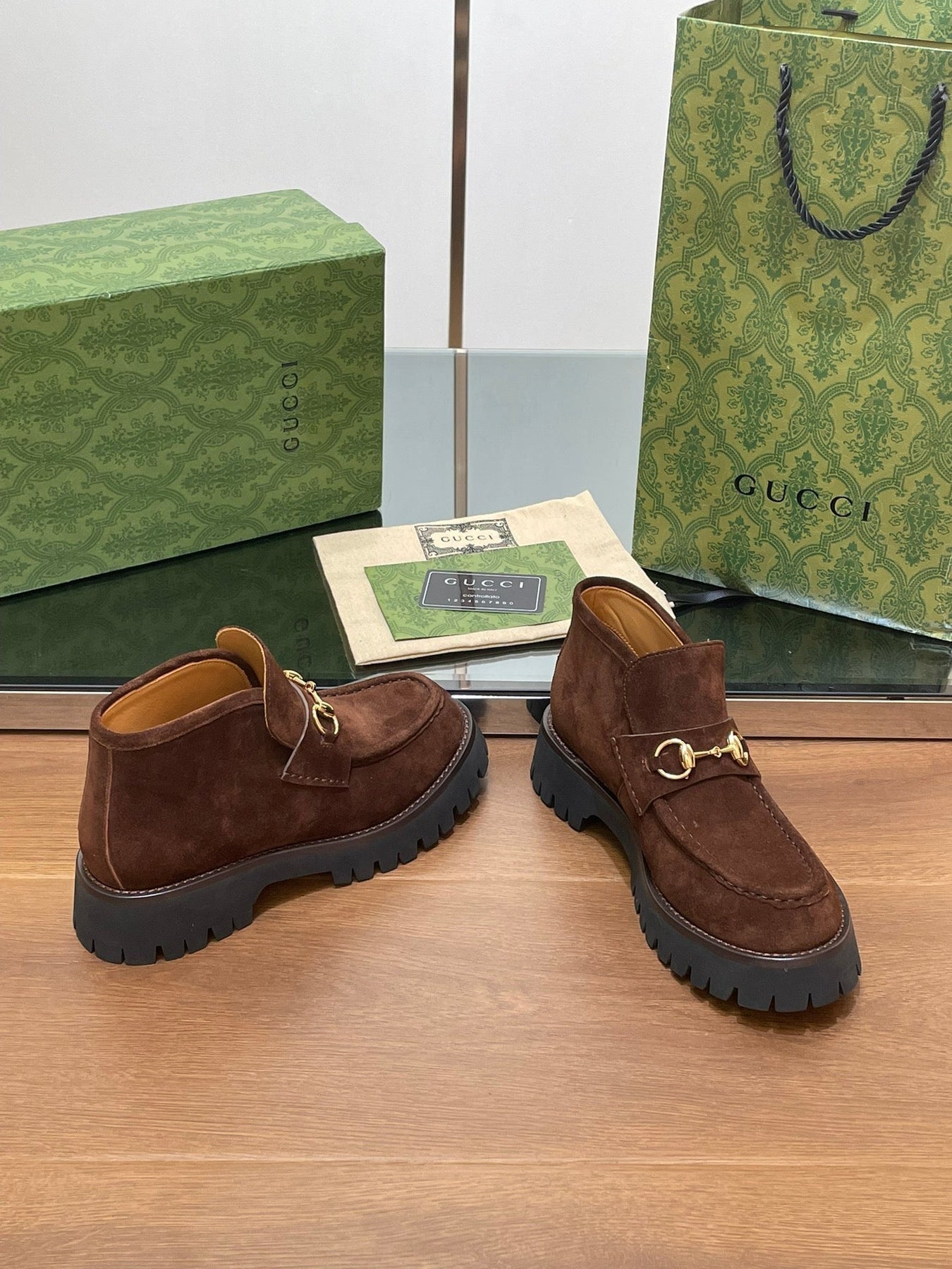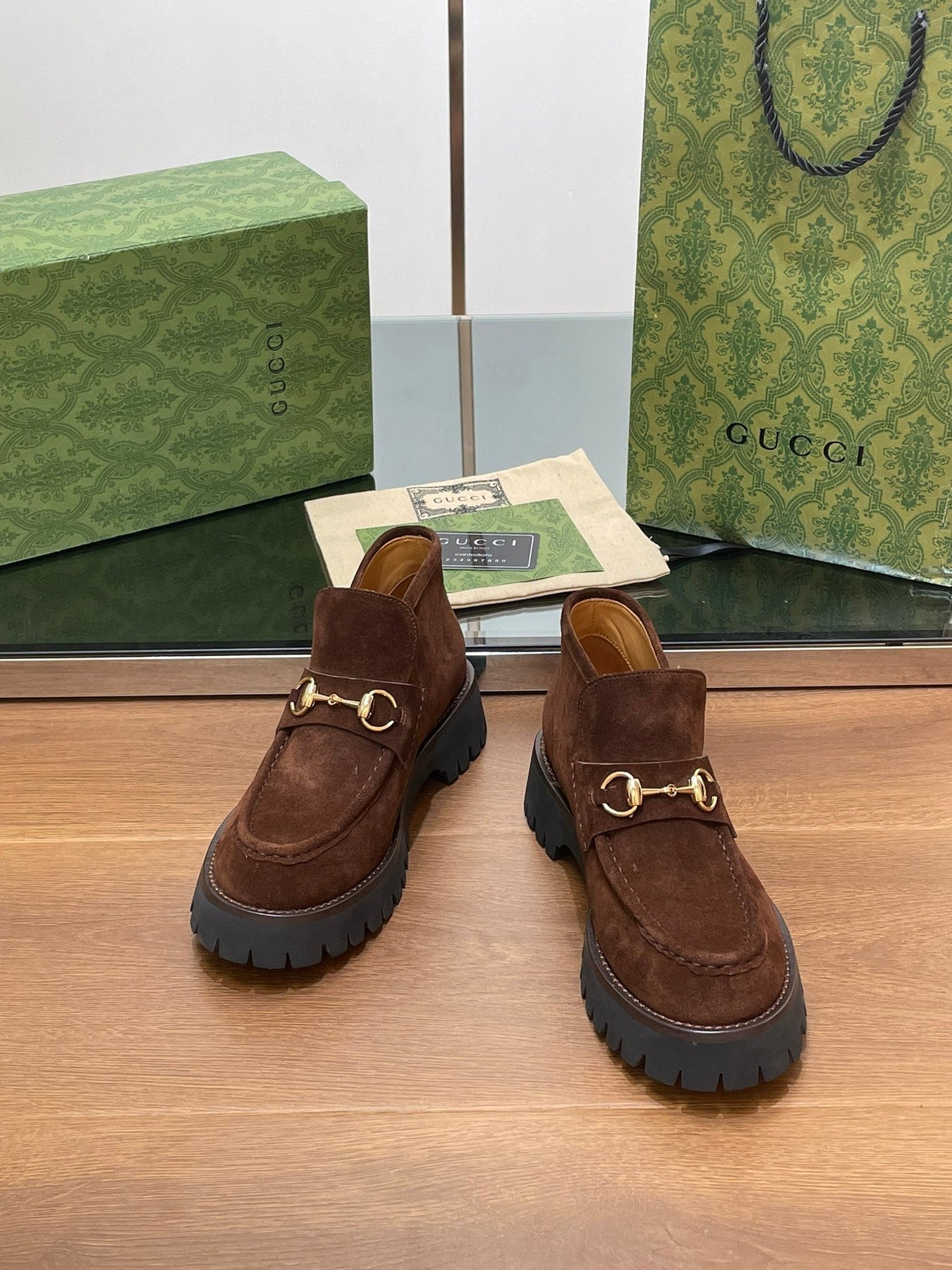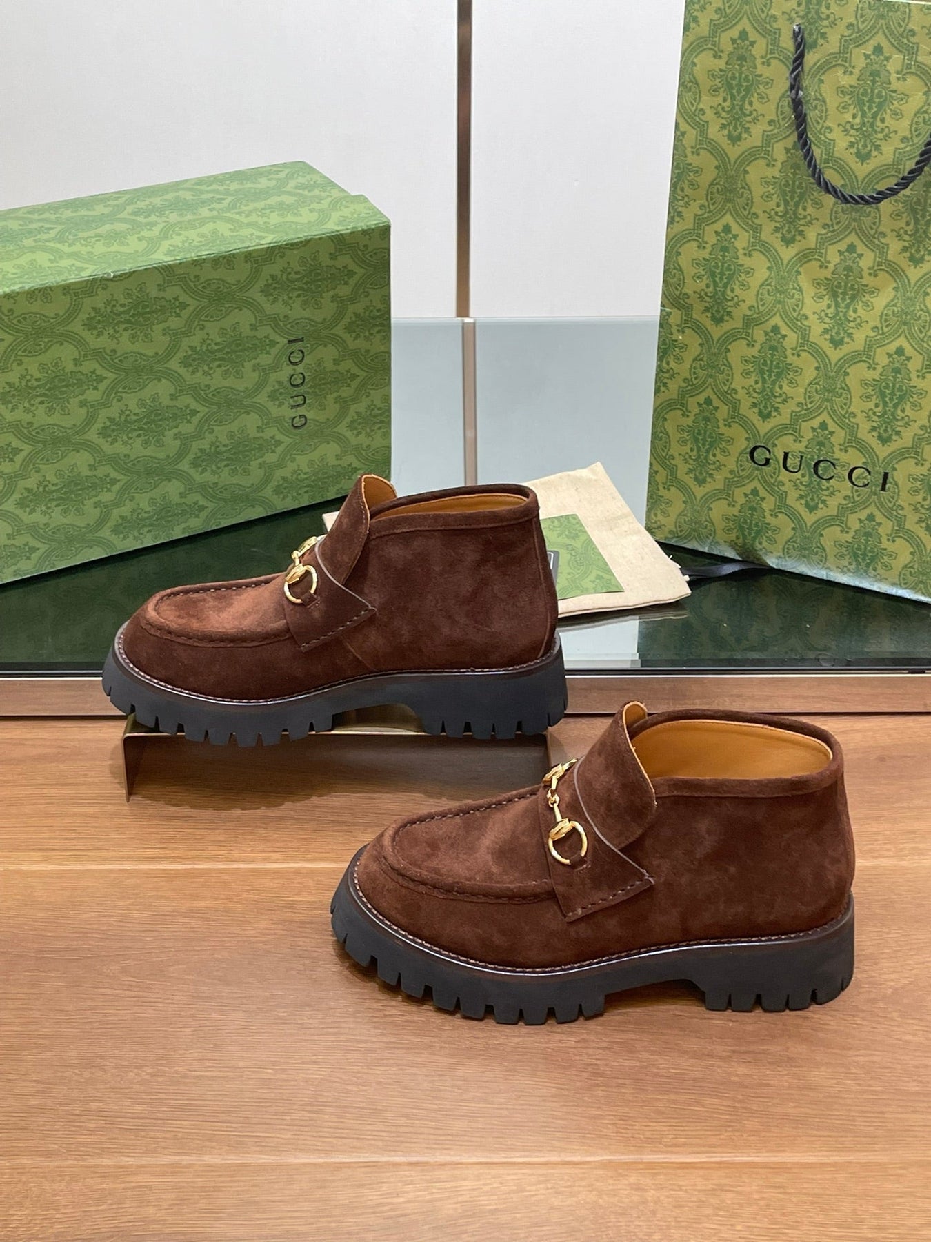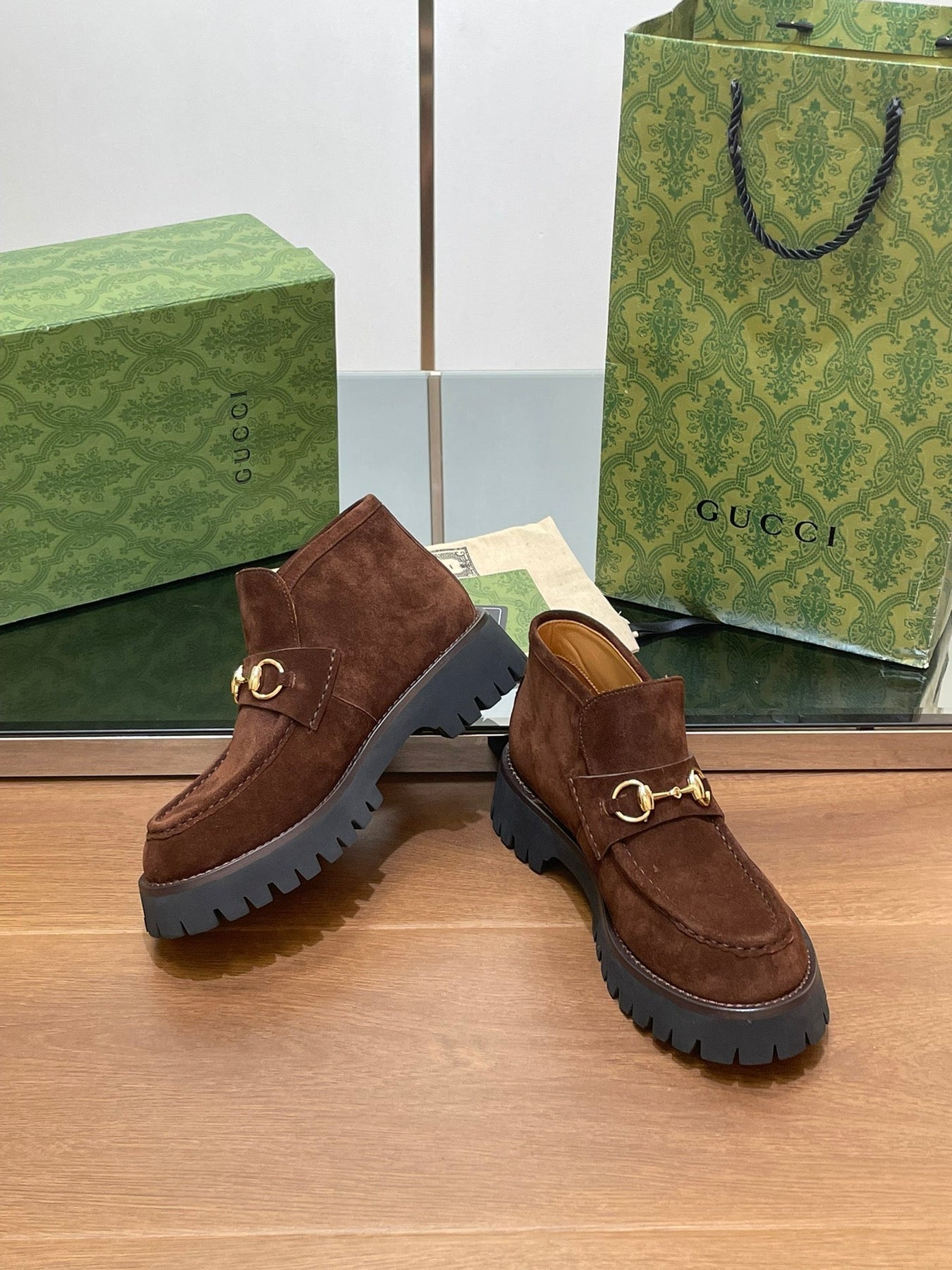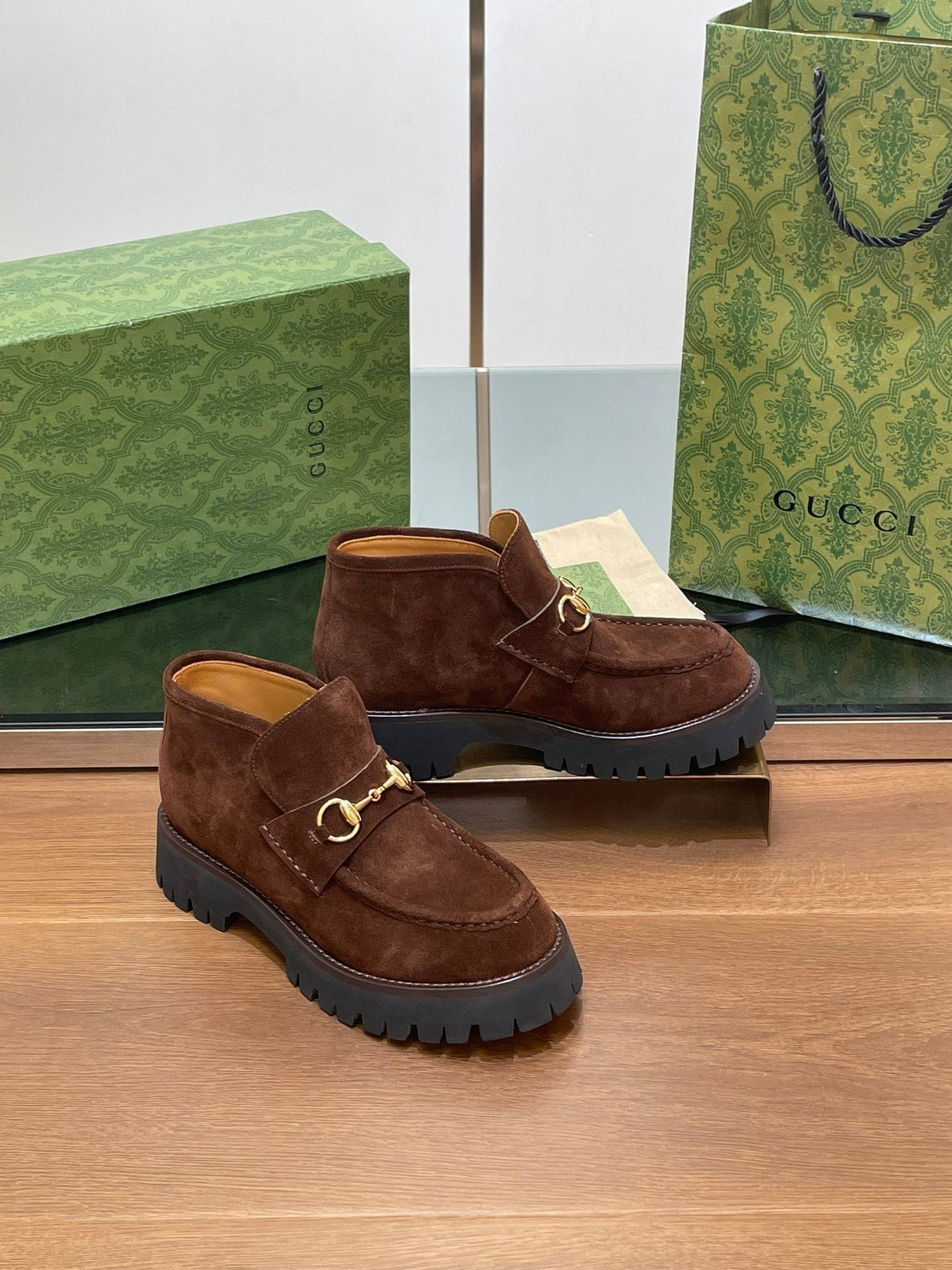 GG WOMEN'S HORSEBIT ANKLE BOOTS 4.5 CM IN DARK BROWN SUEDE