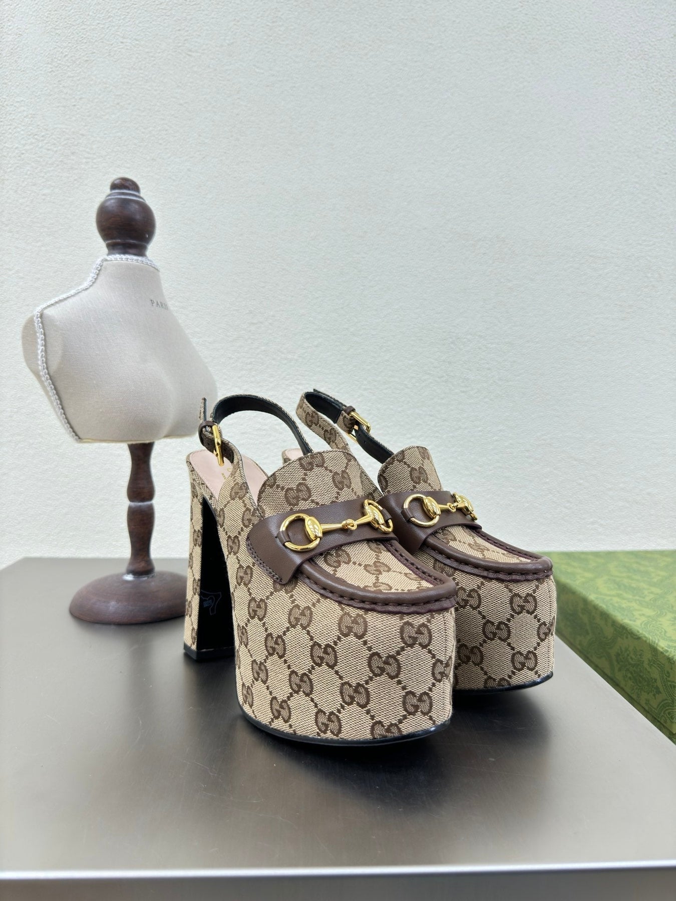 GG WOMEN'S HORSEBIT PLATFORM LOAFER SLINGBACK IN TAN BEIGE CANVAS