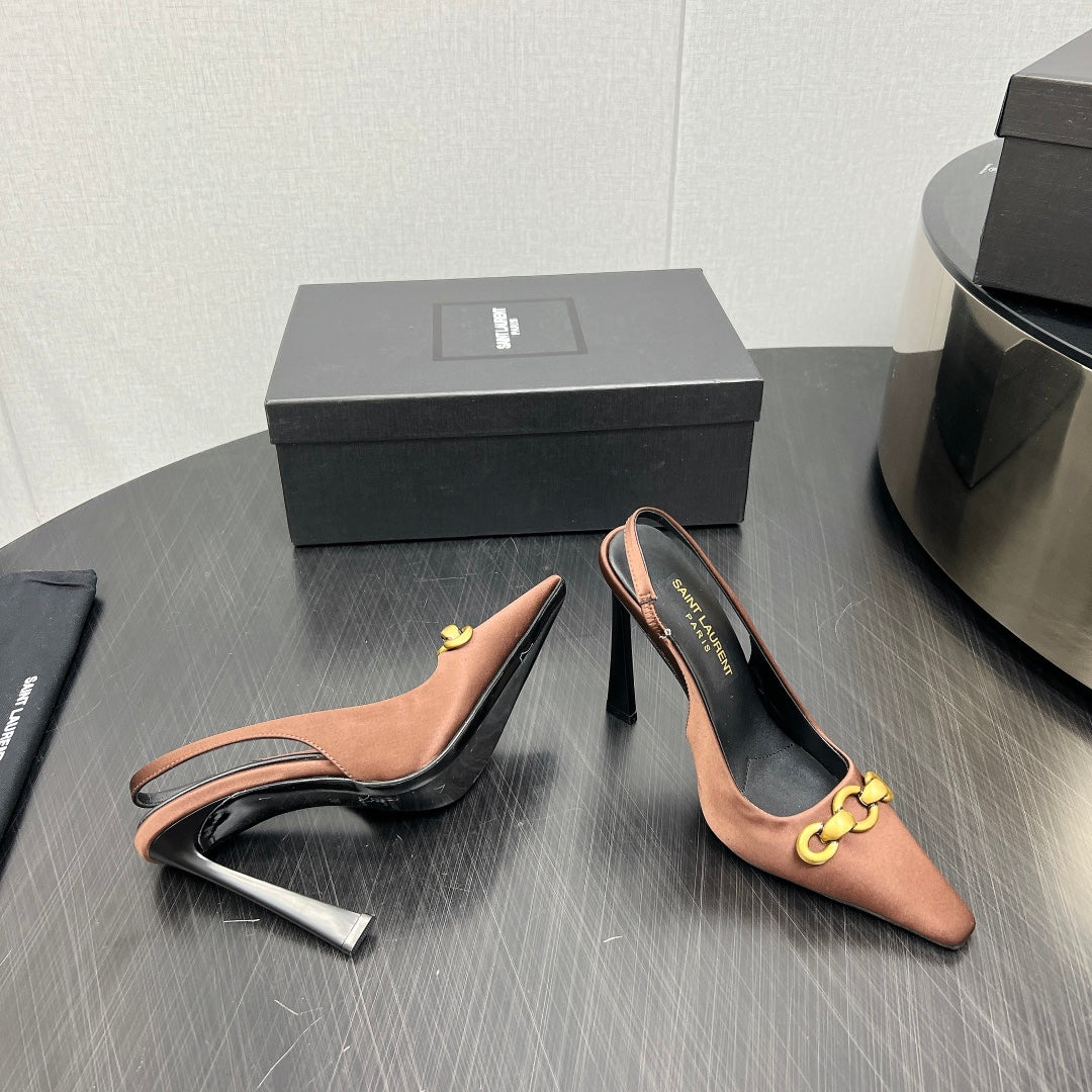 GOLD CHAIN ATTACHED HIGH SLINGBACK IN TOFFEE BROWN SILK