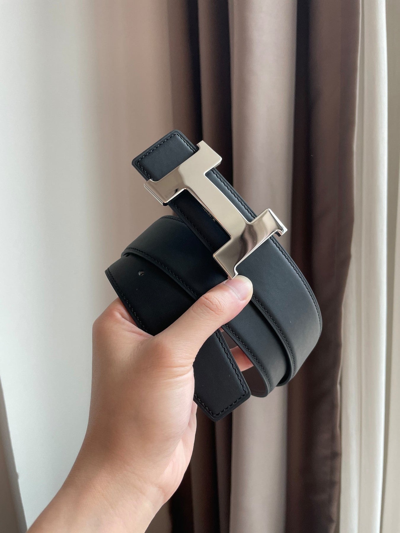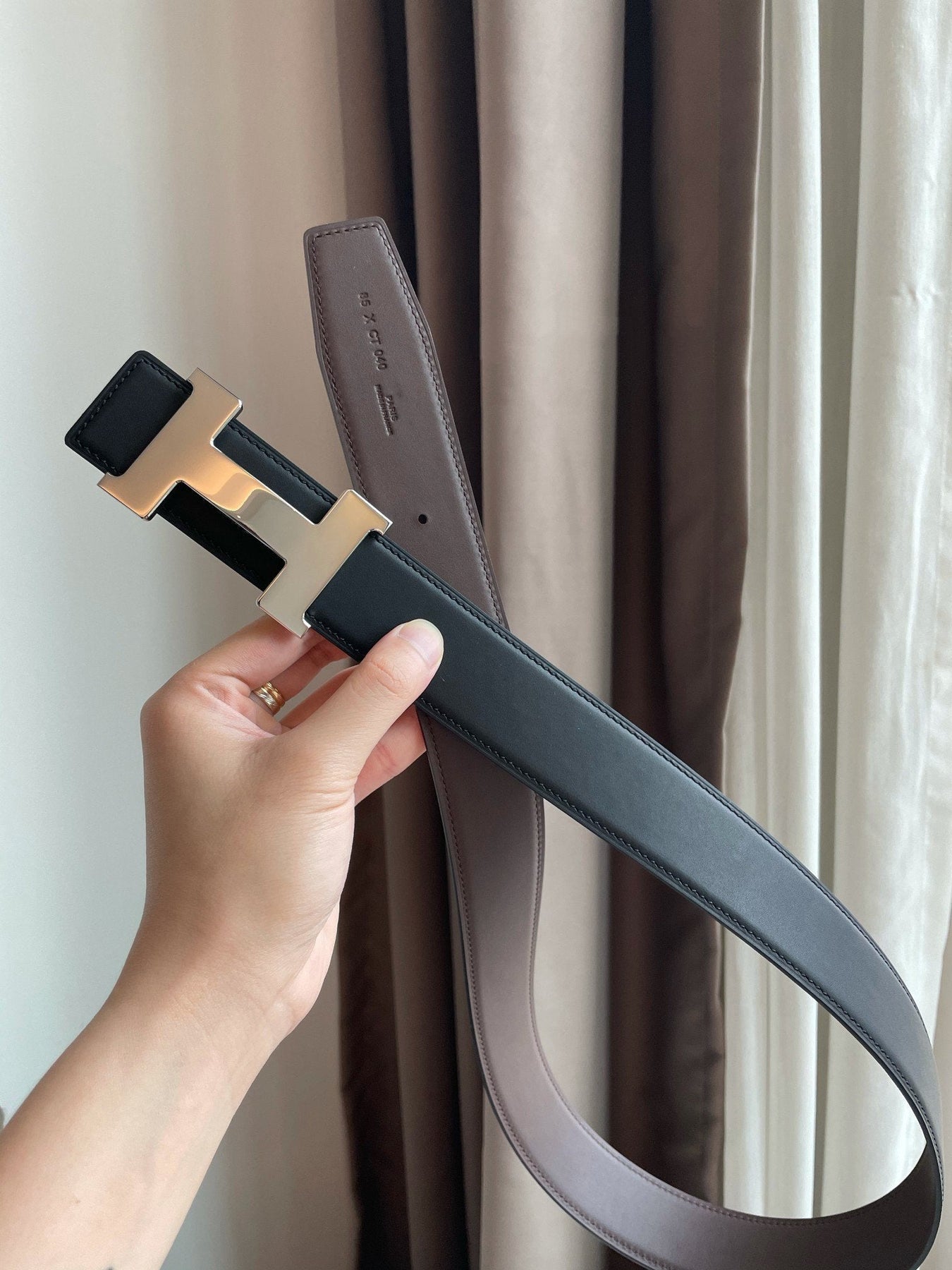 H CONSTANCE BELT 38MM SILVER BUCKLE BLACK CHOCOLATE LEATHER