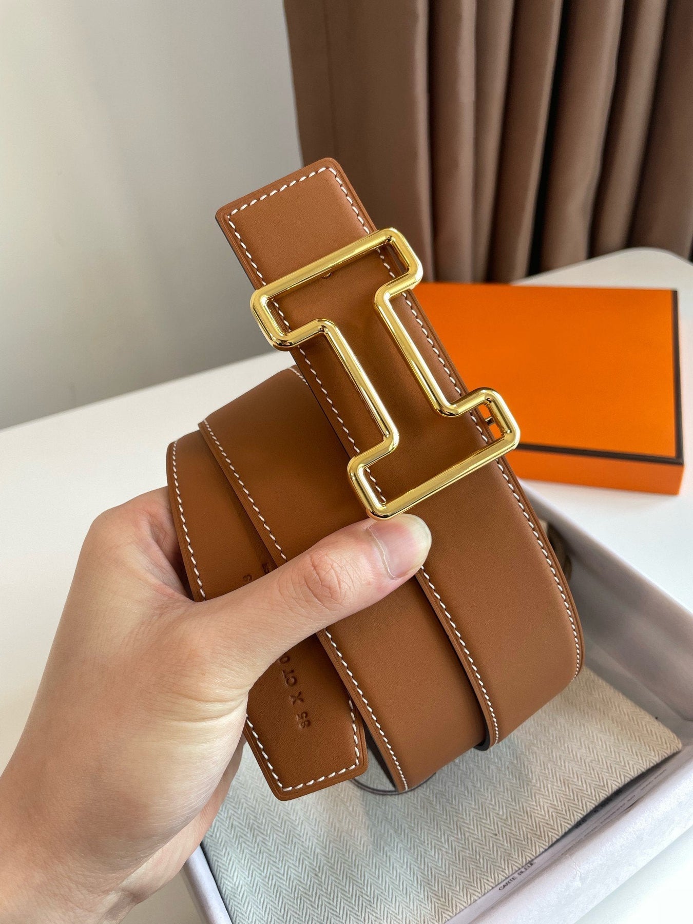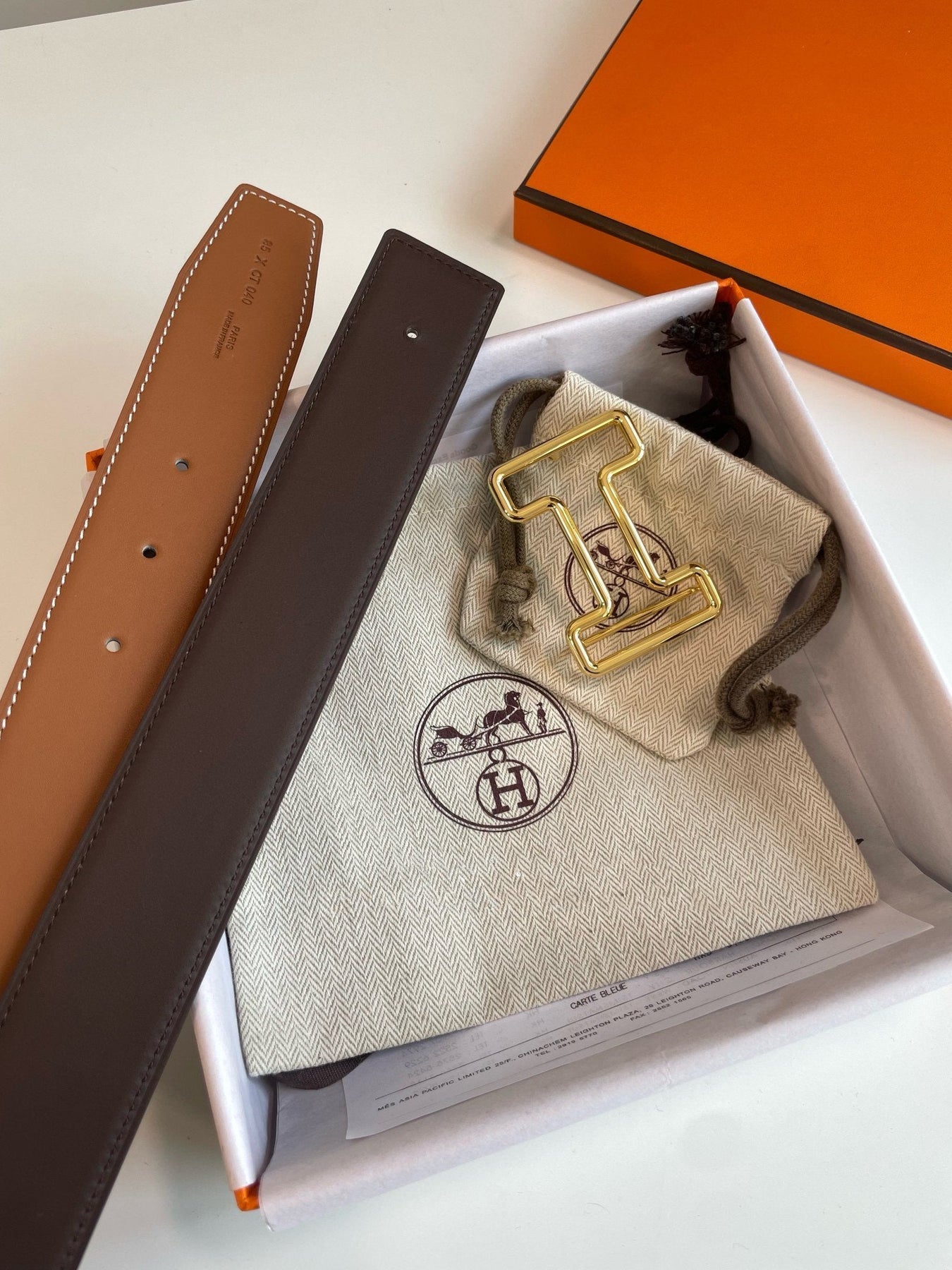 H TONIGHT BELT 38MM GOLD BUCKLE CHESTNUTE GRAPHITE LEATHER