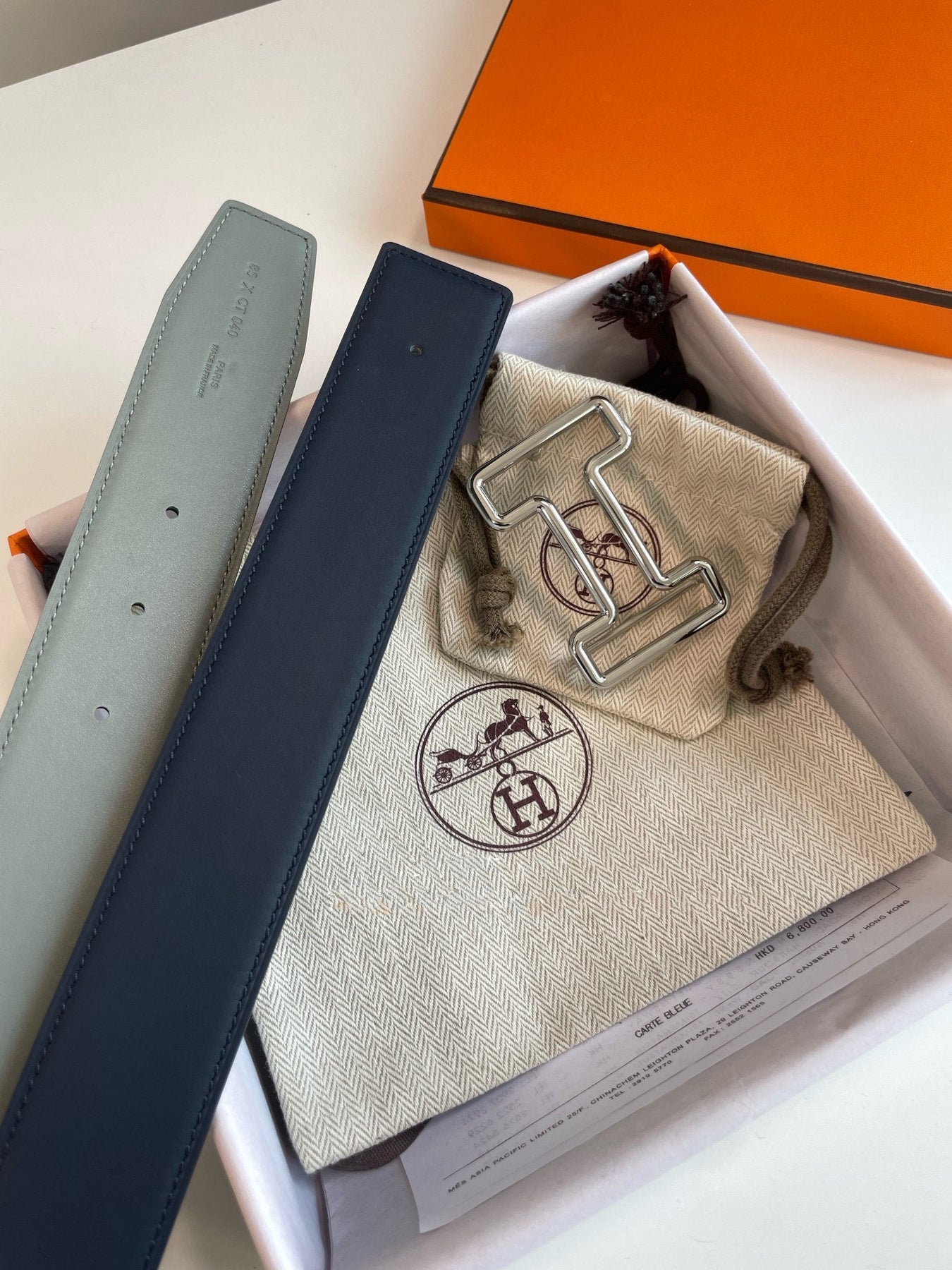 H TONIGHT BELT 38MM SILVER BUCKLE DARK BLUE GREY LEATHER