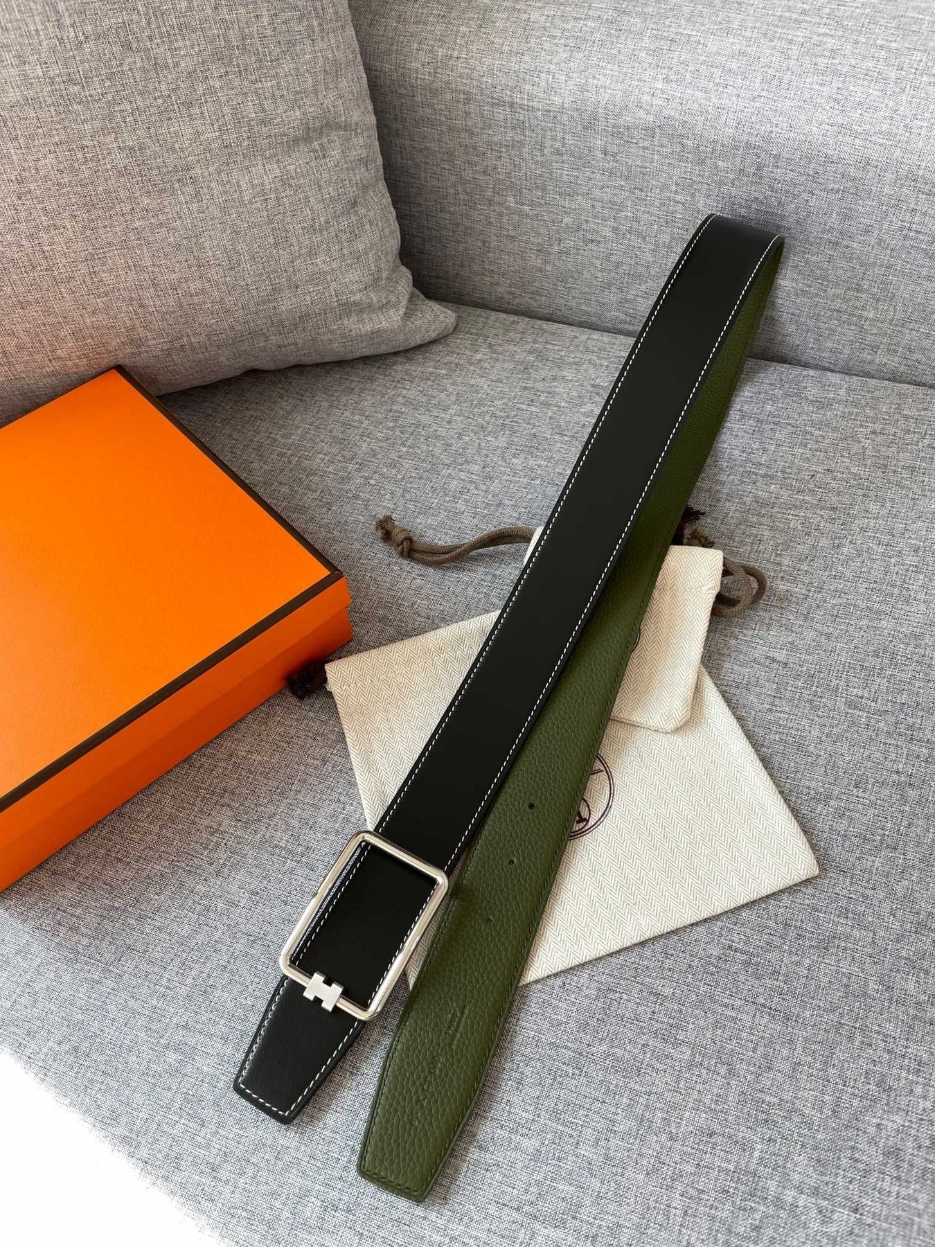 H TUBE BELT 38MM SILVER BUCKLE GREEN BLACK LEATHER