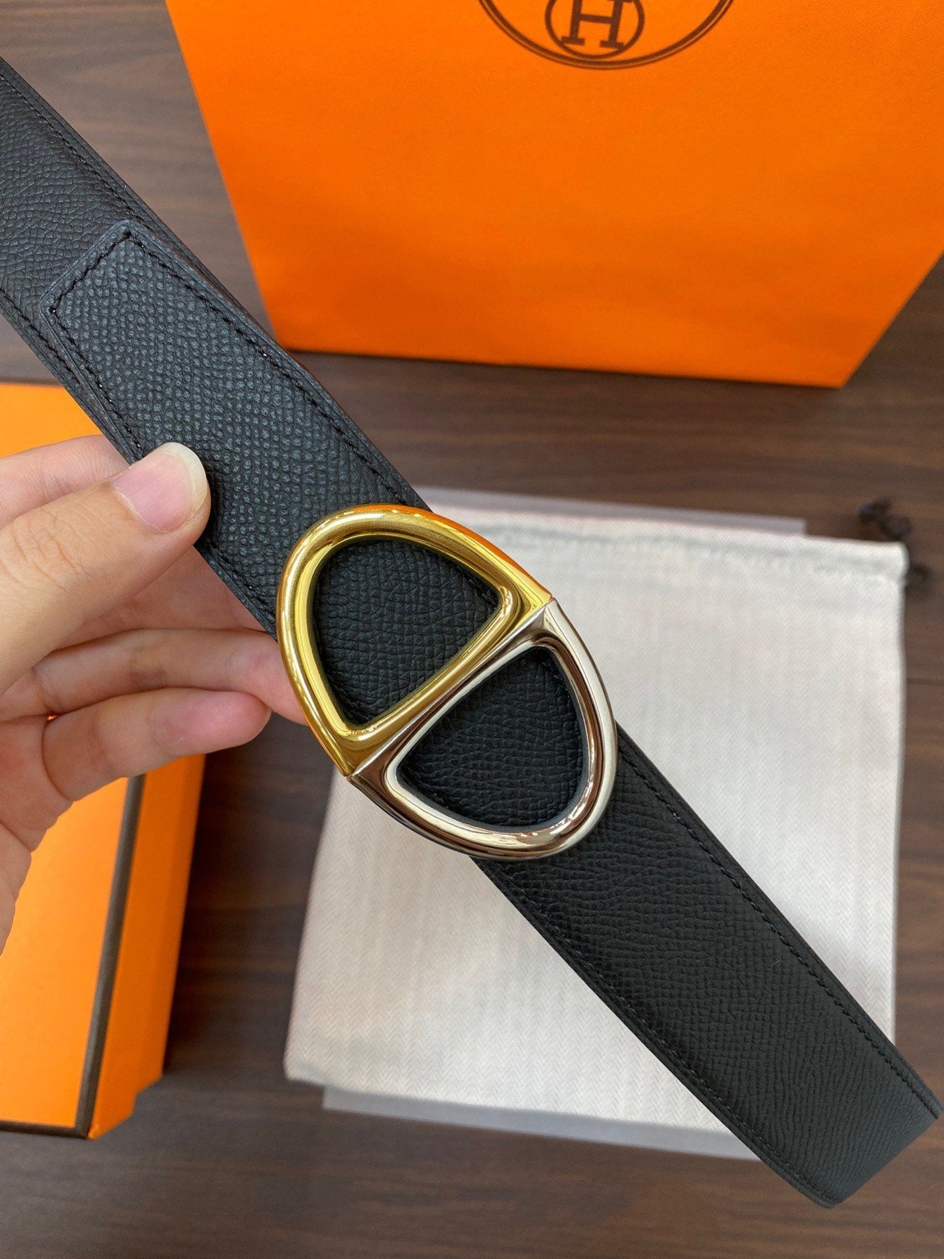 H TWIN REVERSIBLE BELT 32MM GOLD SILVER BUCKLE WHITE BLACK LEATHER