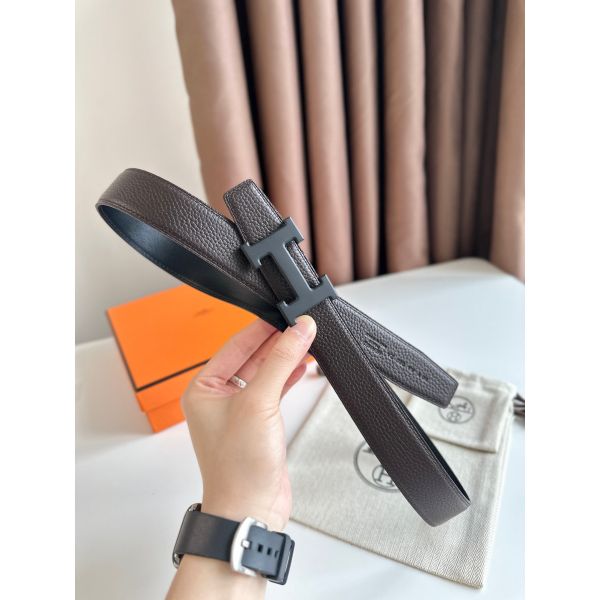 HERM H Reversible 32MM Belt with Matte Buckle in Chocolate Clemence Leather
